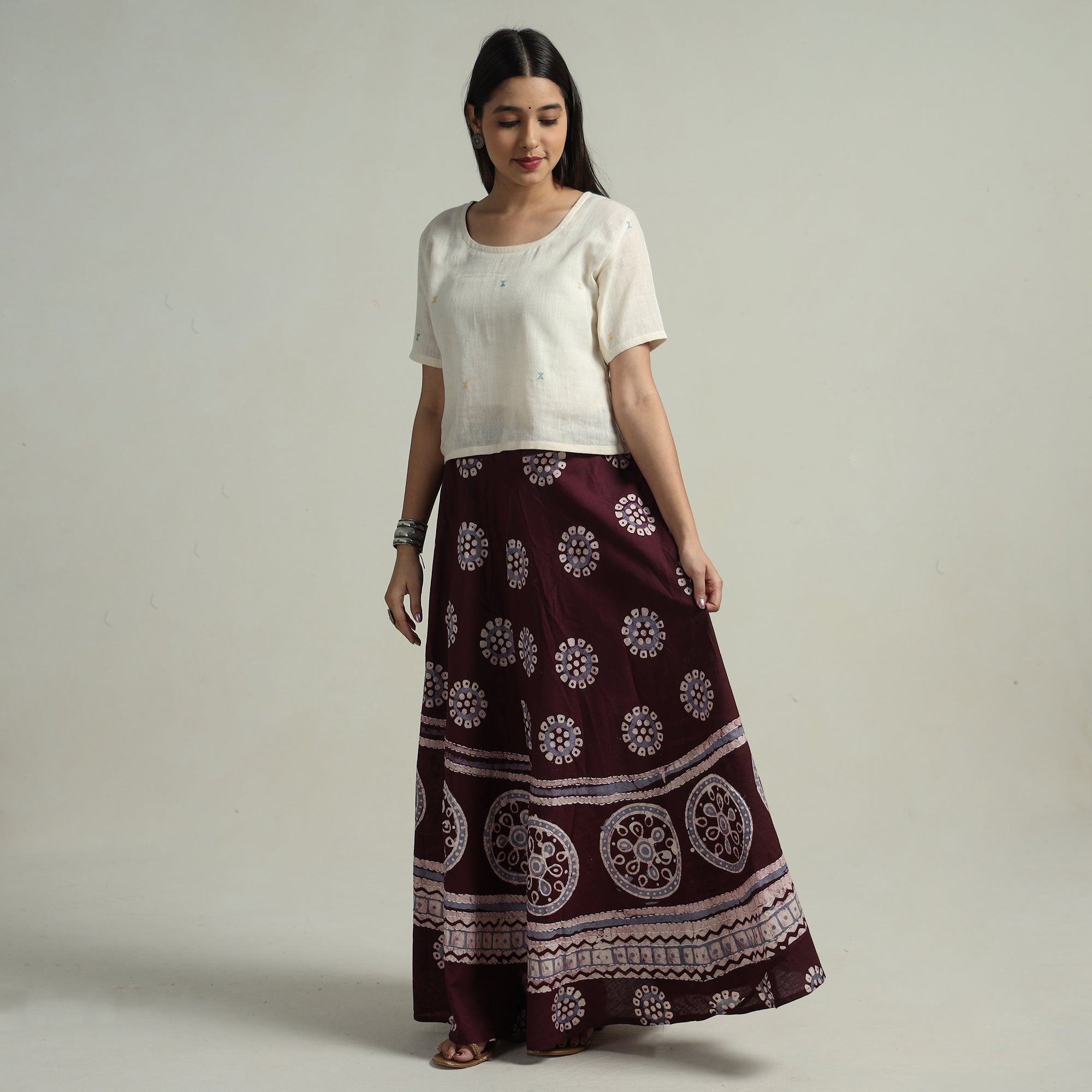 Fine quality maroon hand batik printed cotton long skirt designed with contemporary running stitch patterns. Batik is a technique of wax-resist dyeing applied to whole cloth, or cloth made using this technique. The traditional designs and motifs in Indian batik are often passed down from one generation to another. Super light weight.