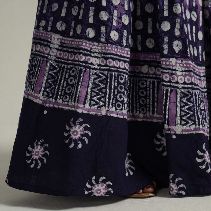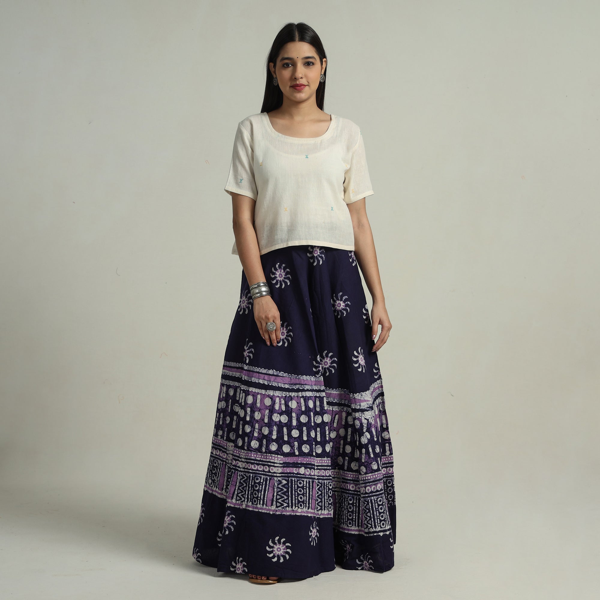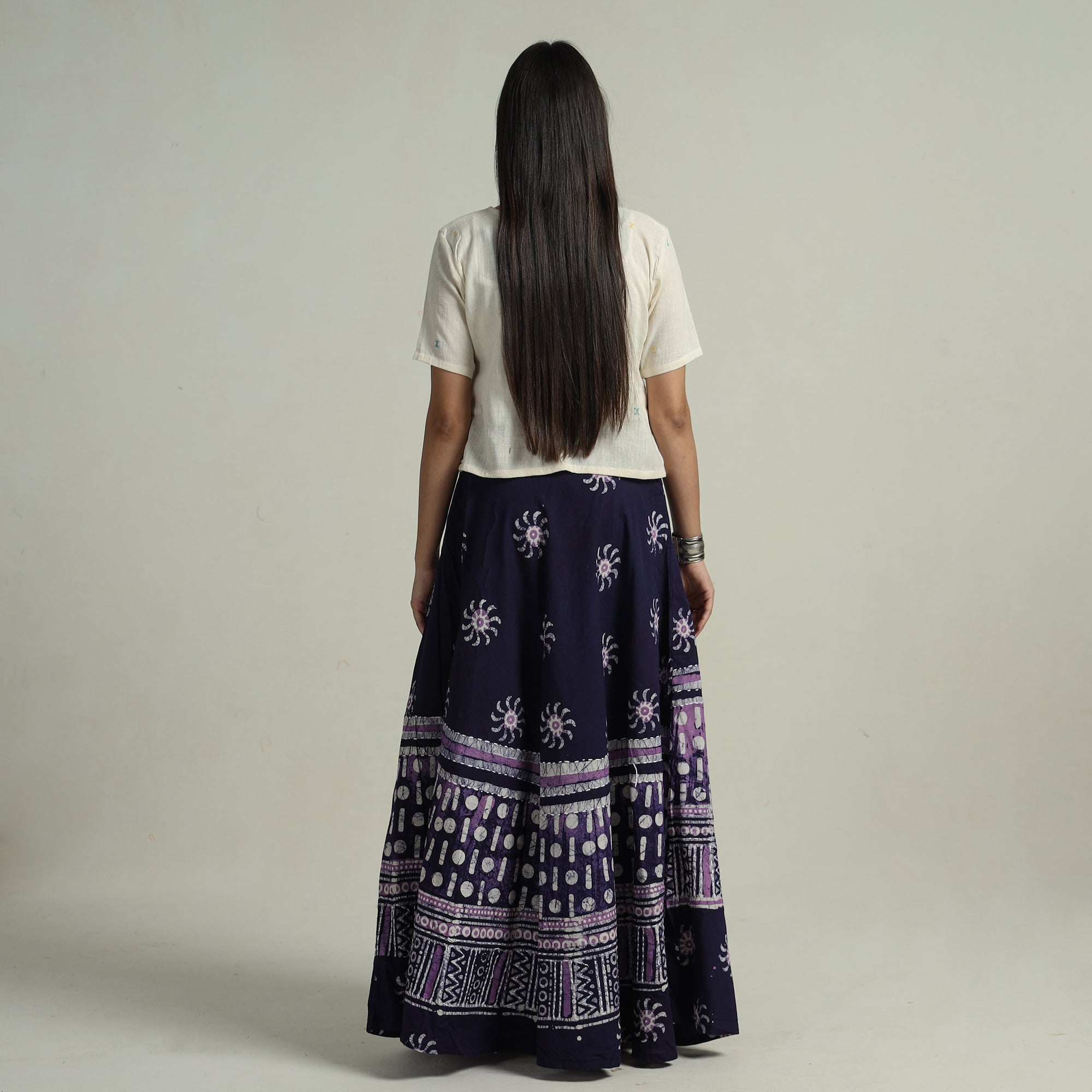 Fine quality blue hand batik printed cotton long skirt designed with contemporary running stitch patterns. Batik is a technique of wax-resist dyeing applied to whole cloth, or cloth made using this technique. The traditional designs and motifs in Indian batik are often passed down from one generation to another. Super light weight.