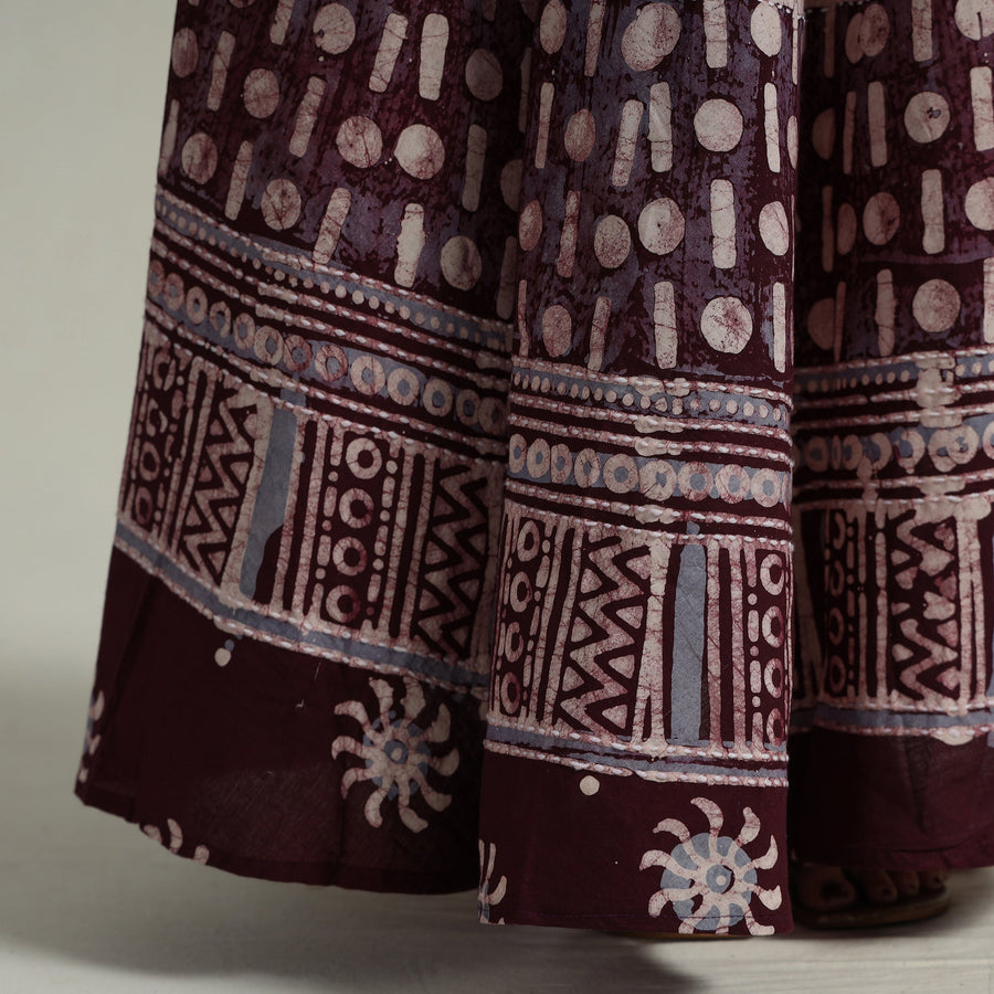 Fine quality maroon hand batik printed cotton long skirt designed with contemporary running stitch patterns. Batik is a technique of wax-resist dyeing applied to whole cloth, or cloth made using this technique. The traditional designs and motifs in Indian batik are often passed down from one generation to another. Super light weight.