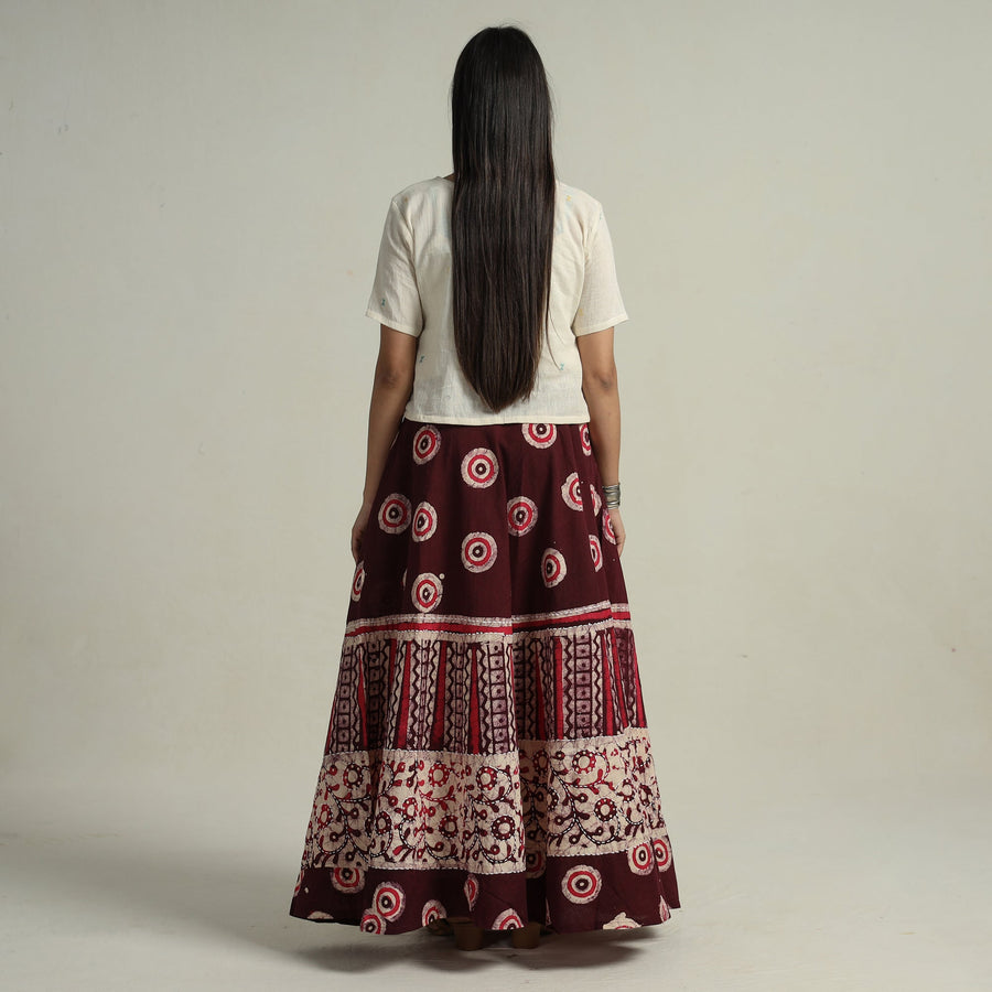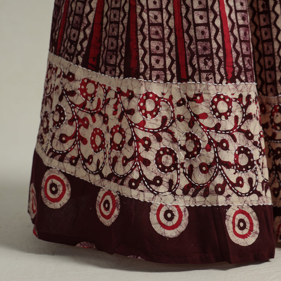 Fine quality maroon hand batik printed cotton long skirt designed with contemporary running stitch patterns. Batik is a technique of wax-resist dyeing applied to whole cloth, or cloth made using this technique. The traditional designs and motifs in Indian batik are often passed down from one generation to another. Super light weight.
