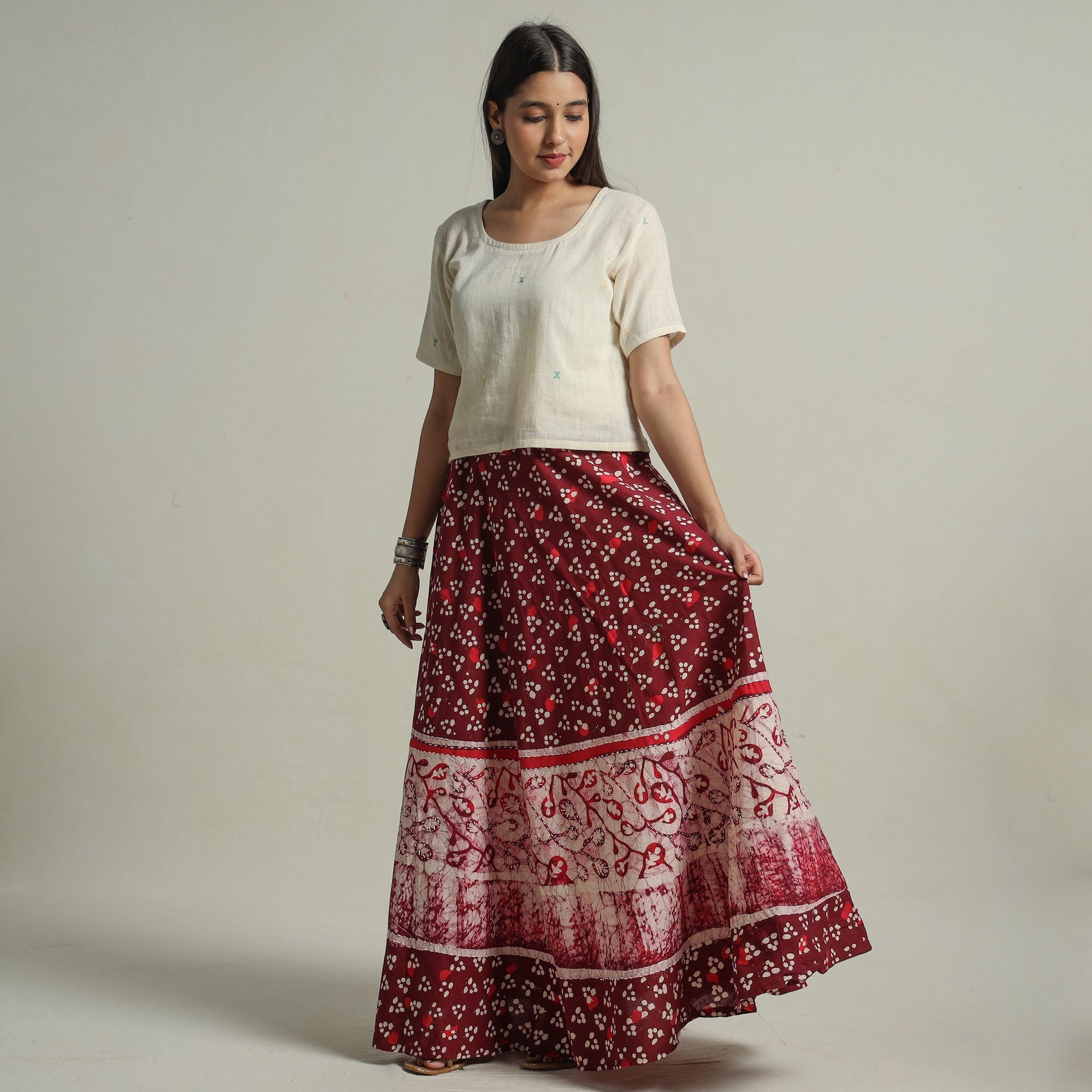 Fine quality maroon hand batik printed cotton long skirt designed with contemporary running stitch patterns. Batik is a technique of wax-resist dyeing applied to whole cloth, or cloth made using this technique. The traditional designs and motifs in Indian batik are often passed down from one generation to another. Super light weight.
