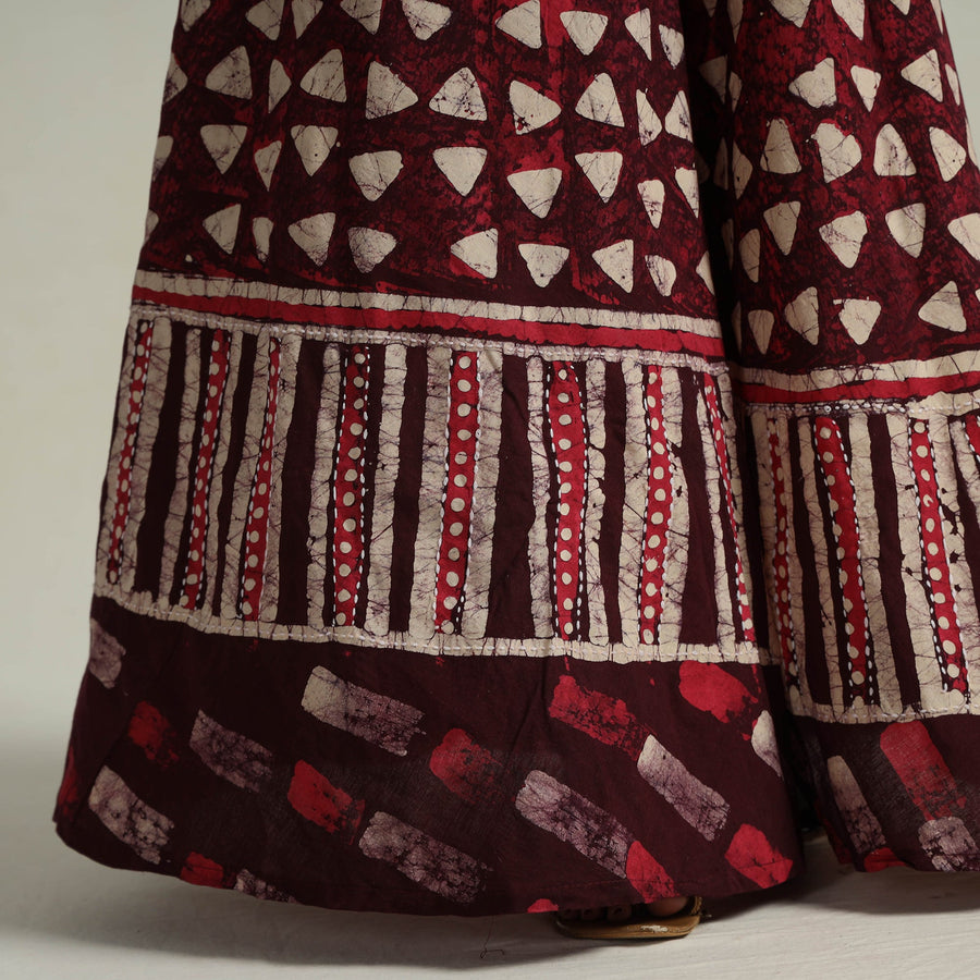 Fine quality maroon hand batik printed cotton long skirt designed with contemporary running stitch patterns. Batik is a technique of wax-resist dyeing applied to whole cloth, or cloth made using this technique. The traditional designs and motifs in Indian batik are often passed down from one generation to another. Super light weight.