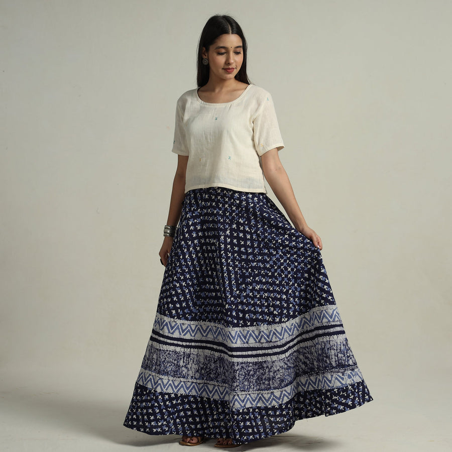 Fine quality hand batik printed cotton long skirt designed with contemporary running stitch patterns. Batik is a technique of wax-resist dyeing applied to whole cloth, or cloth made using this technique. The traditional designs and motifs in Indian batik are often passed down from one generation to another. Super light weight.