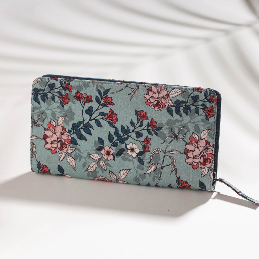 Fine quality green floral printed cotton wallet, made from printed cotton fabric. It has one zipper pocket, two simple pockets, and six card slots inside.