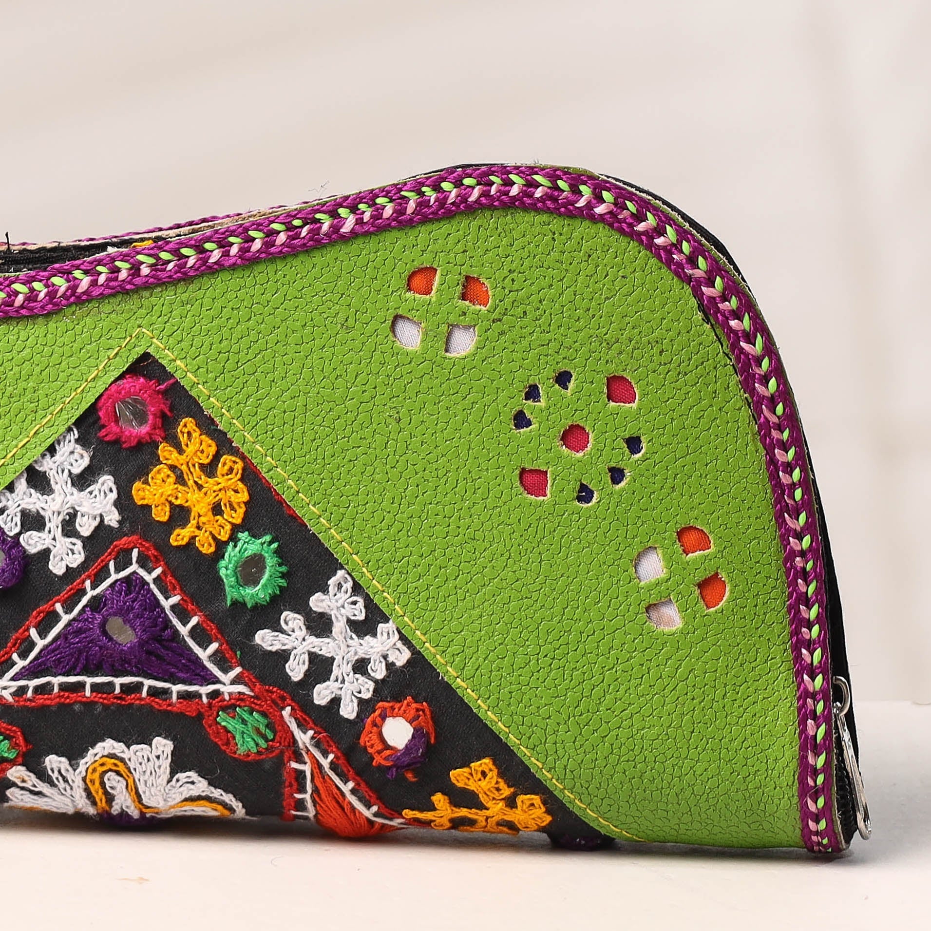 Handcrafted Kutch embroidery leather green clutch / wallet. This wallet is crafted from leather with intricate and beautiful hand embroidered mirror work done by craftswomen in the Kutch region of Gujarat. It has three sections for keeping your cash and bills, with two separate zipper pockets for coins and important documents. The Kutch Embroidery is a handicraft and textile signature art tradition of the tribal community of Kutch district in Gujarat.