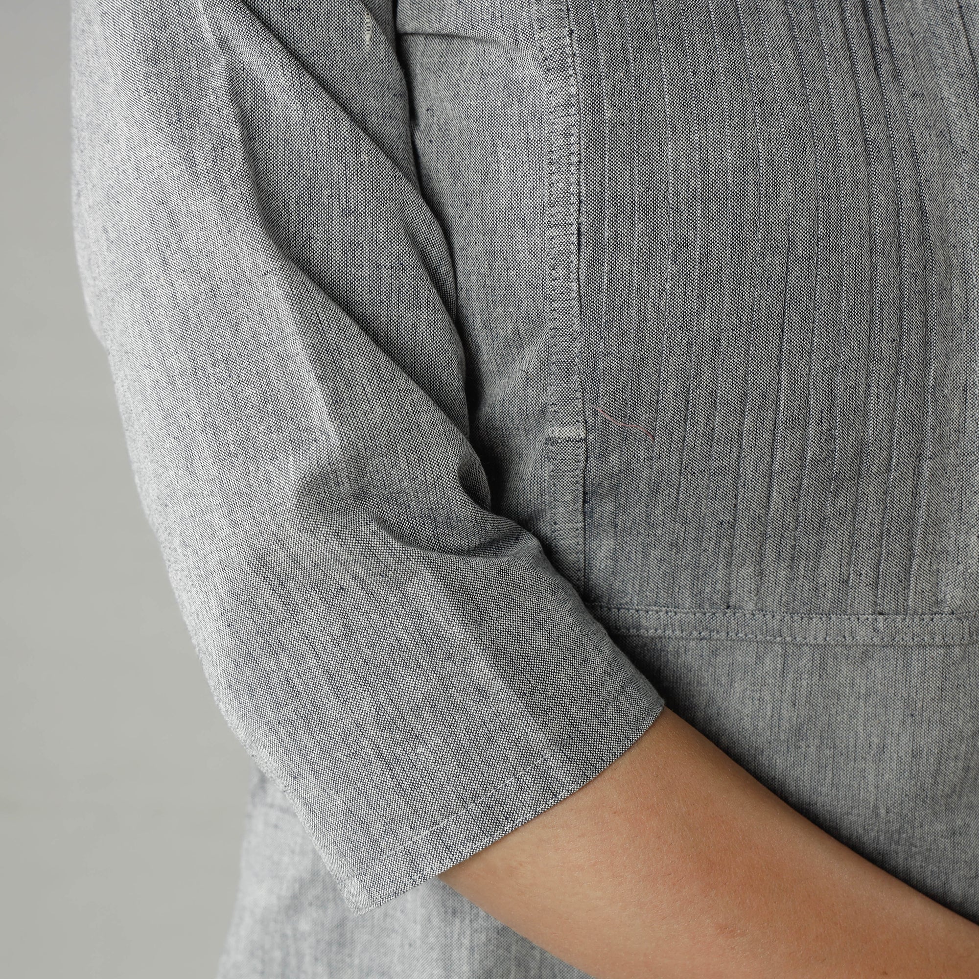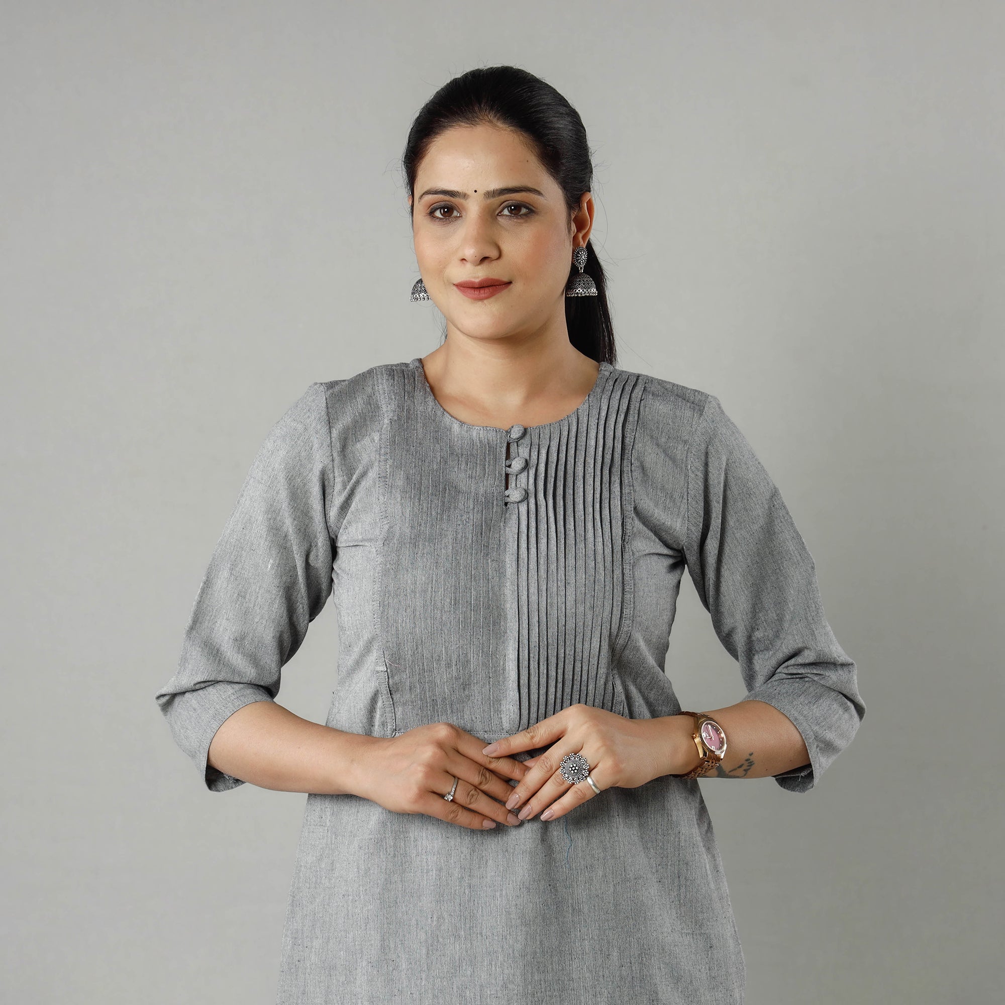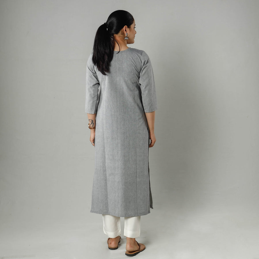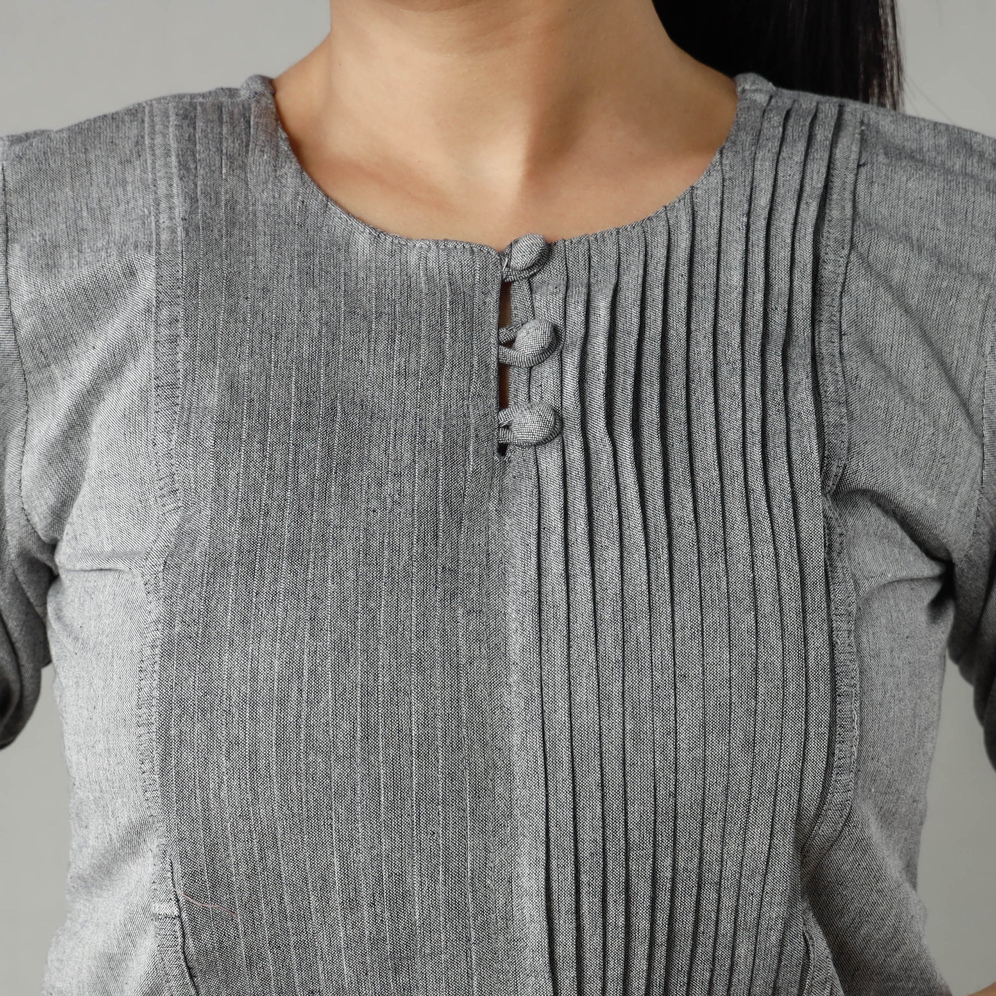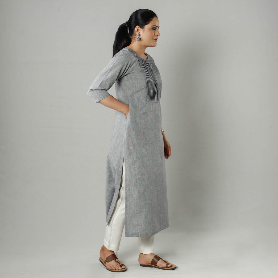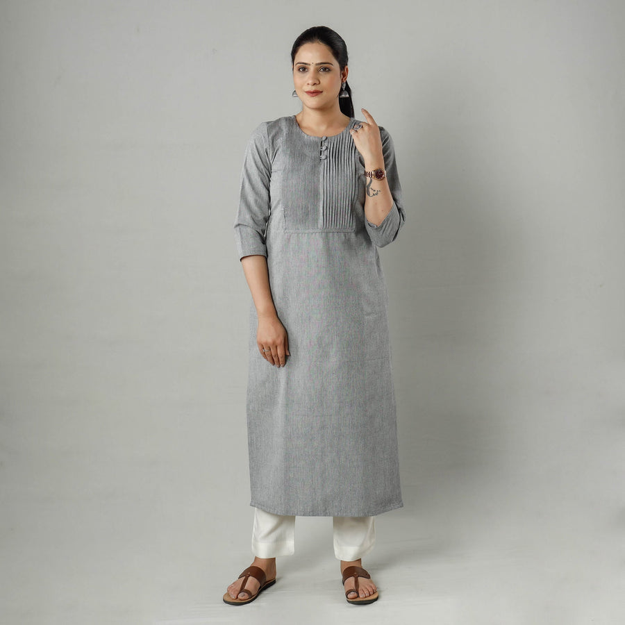 Look and feel beautiful in this uniquely designed plain jhiri handloom cotton pintuck long kurta with one side pocket. This cotton kurta makes you comfortable with ease all day long.