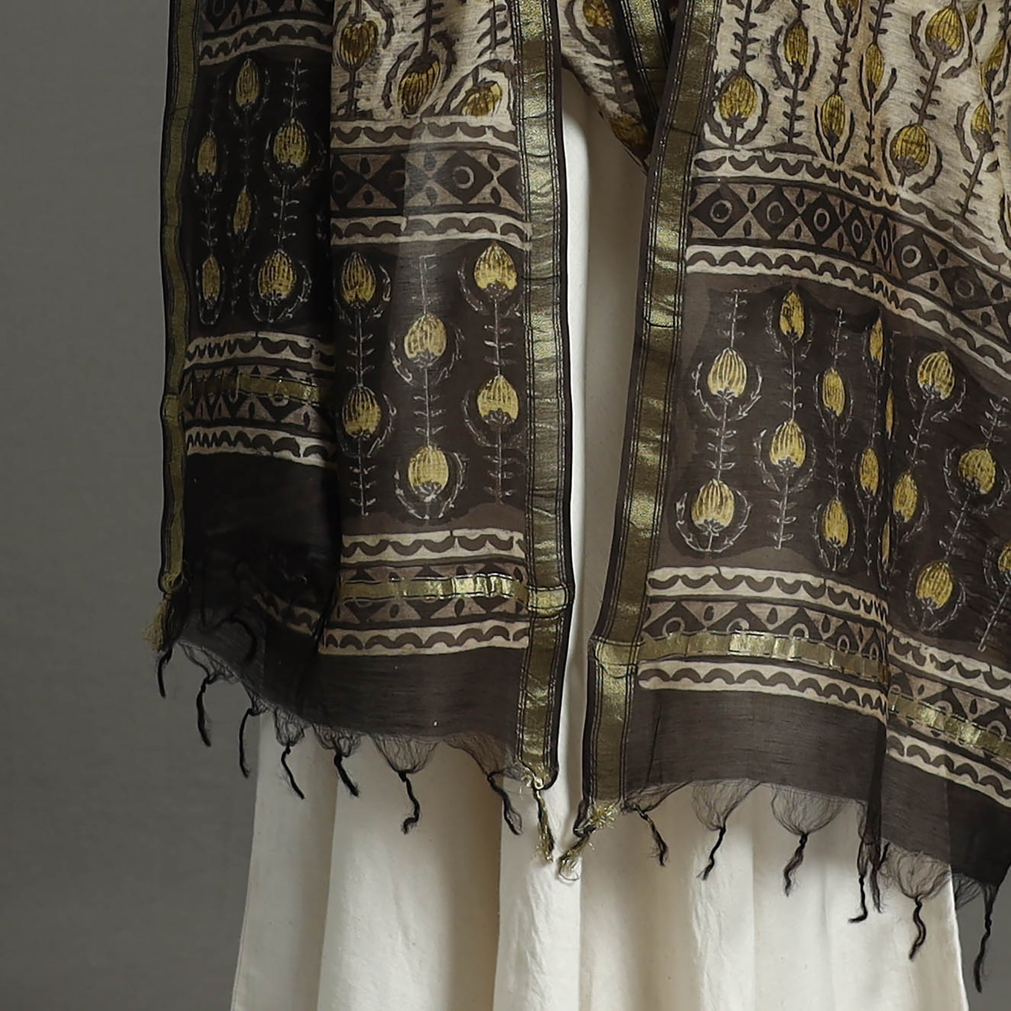 Enhance your style with our beige bagru ajrakh dabu hand block printed chanderi silk cotton dupatta with zari border made using natural dyes through the traditional ajrakh and dabu techniques of hand-block printing practiced by the artisans in the Bagru region of Rajasthan. This dupatta showcases the rich heritage and skilled craftsmanship of the artisans. Perfect for adding a touch of tradition to any ensemble.