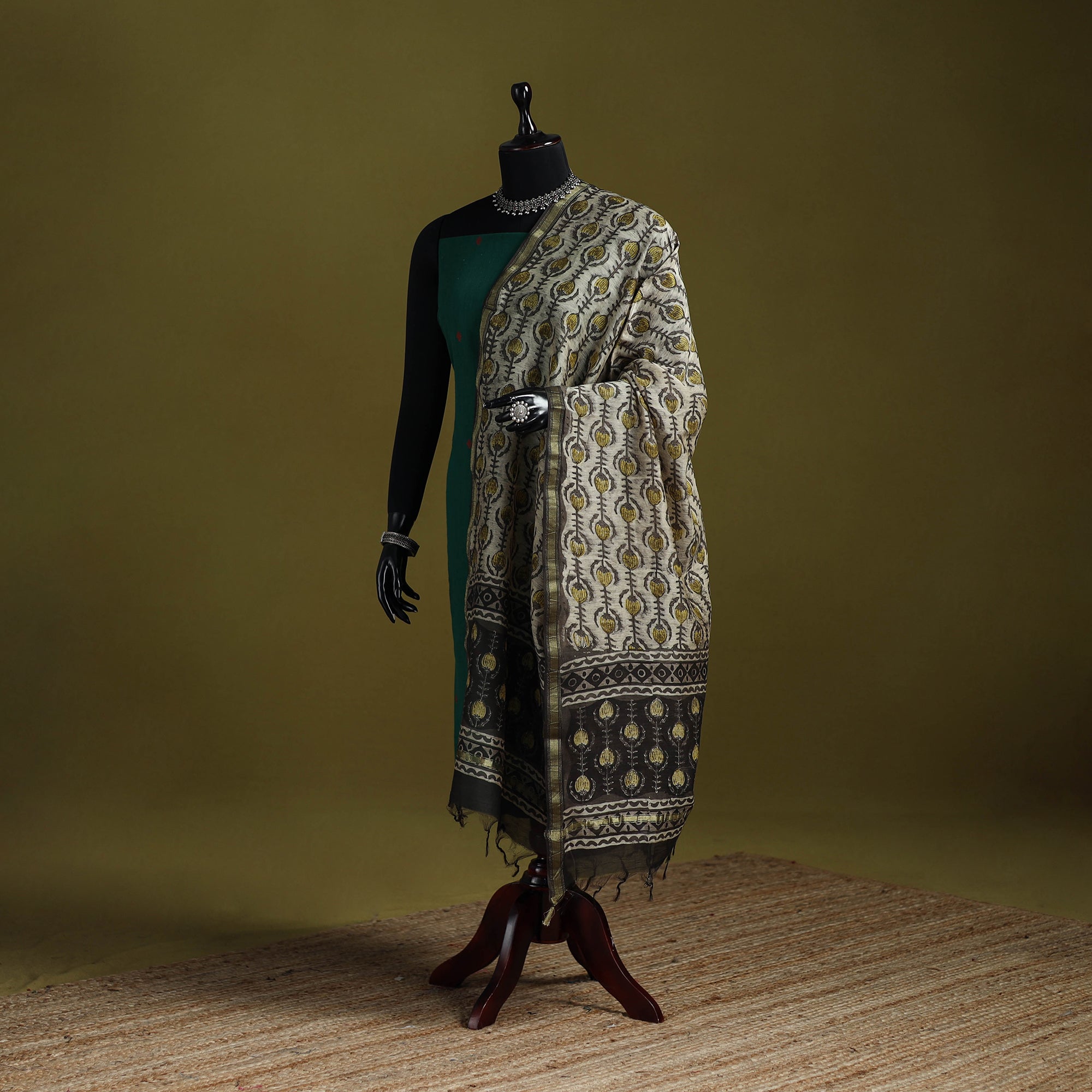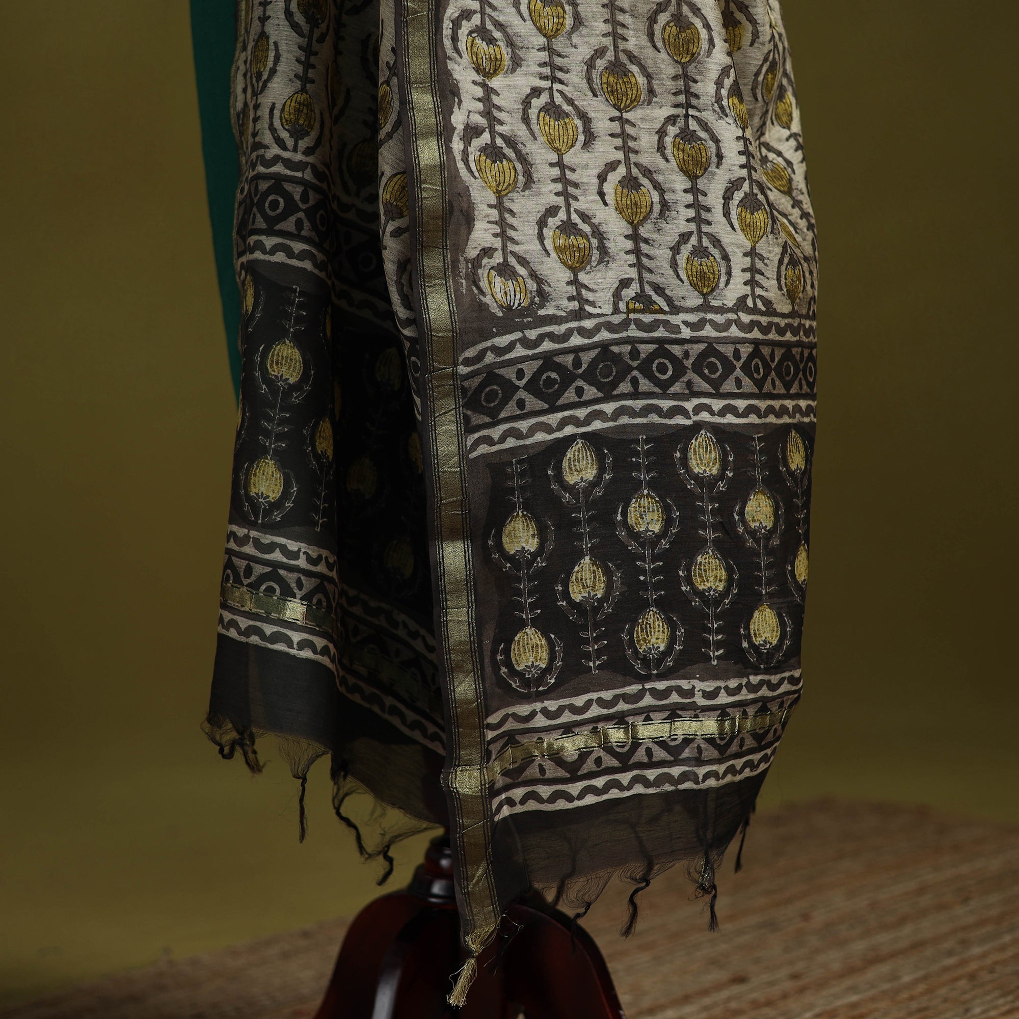 | Material | Beige ajrakh dabu bagru hand block print dupatta with zari border comes from the village of Bagru in Rajasthan, where artisans have practiced the mud-resist printing technique for over 400–450 years. Printed on chanderi silk cotton using hand carved wooden blocks with natural dyes. This versatile dupatta complements any outfit, making it a perfect accessory for casual outings or special events, effortlessly combining traditional craftsmanship with contemporary elegance. |