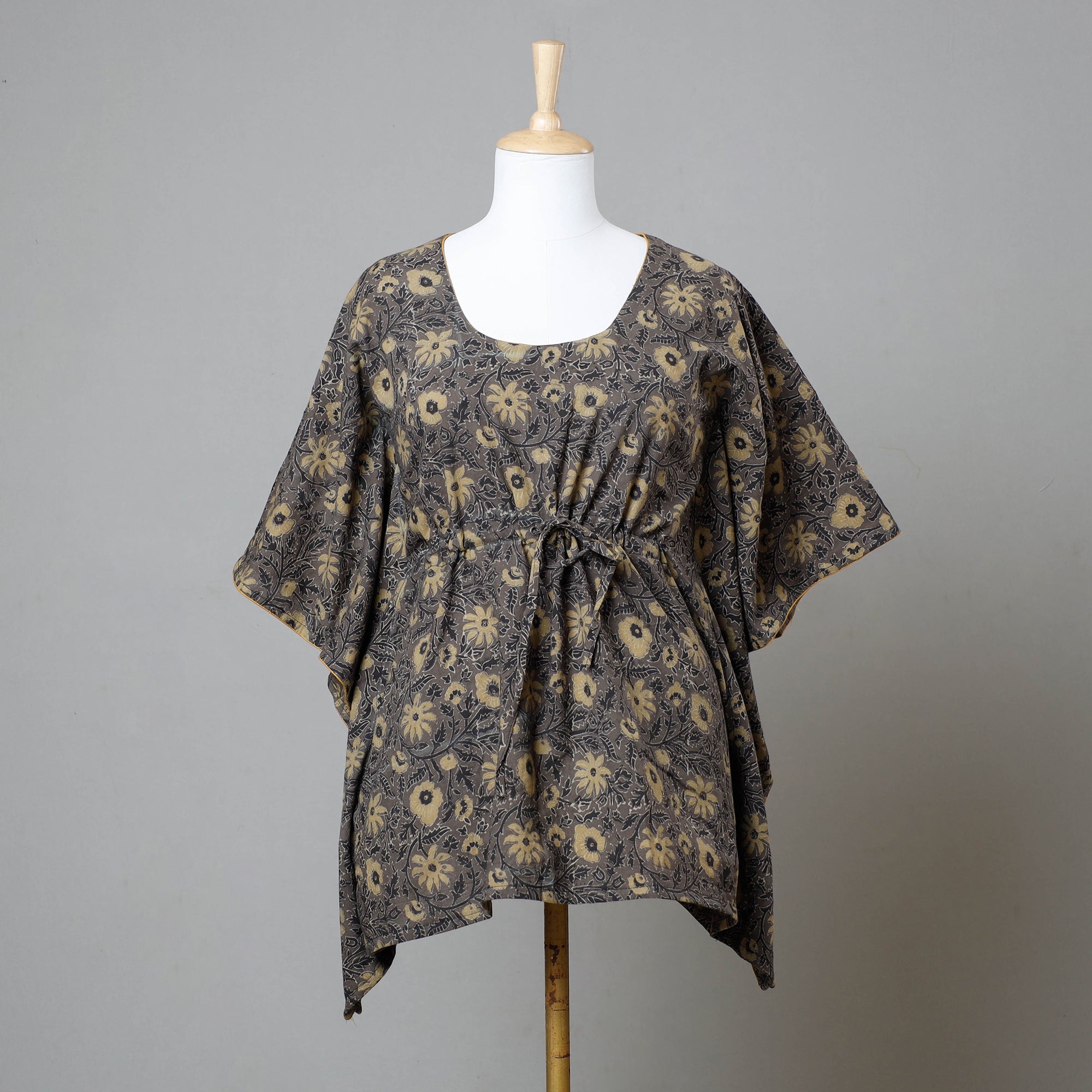 Fine quality ajrakh hand block printed cotton kaftan with tie-up waist. A traditional kaftan or caftan is a short length garment with long, flowing sleeves. It has an adjustable drawstring waist. These loose-fitting cotton kaftans are enhanced by a soft touch and beautiful hand-block prints. This dress will allow you to move with ease and comfort. The drawstring waist tie will give you the freedom to customise the fit to suit your unique shape.
