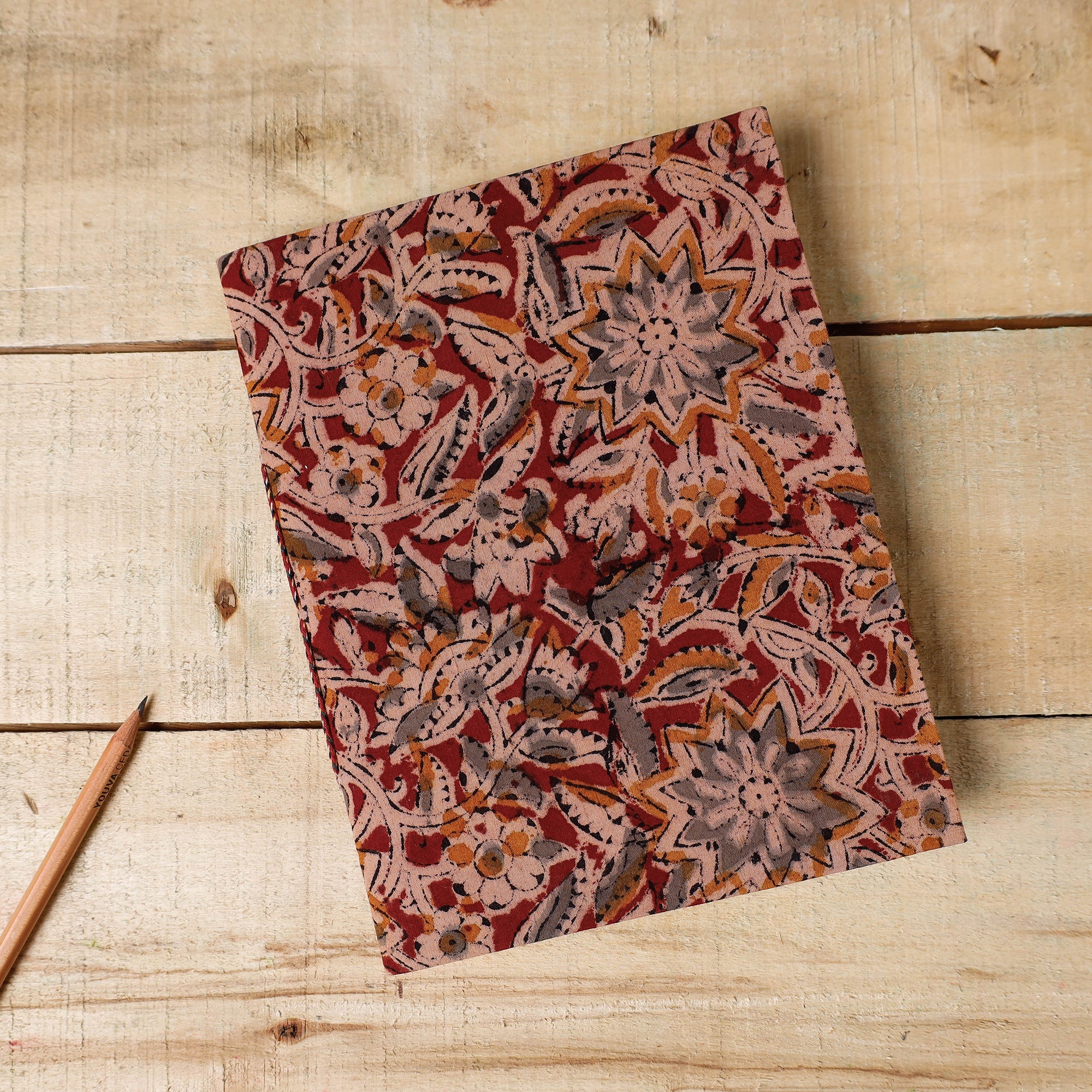 | Material | Red kalamkari block printed cotton fabric embellished hard bound cover notebook with handmade papers. This paper is made of cotton, paper and other natural fibre waste recycled in an eco-friendly manner without the use of chemicals. Handmade by master artisans who maintain careful personal attention to detail. They are highly skilled in a variety of bookbinding and handmade stationery manufacturing techniques. |