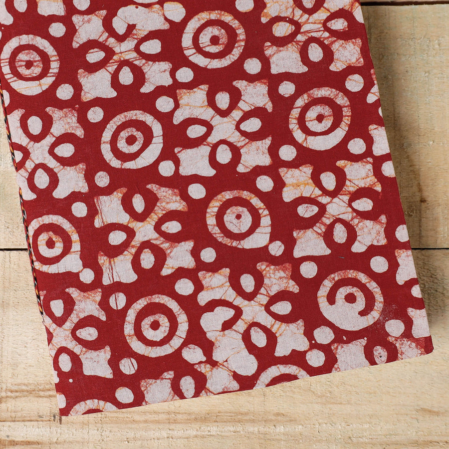 | Material | Red hand batik printed cotton fabric embellished hard bound cover notebook with handmade papers. This paper is made of cotton, paper and other natural fibre waste recycled in an eco-friendly manner without the use of chemicals. Handmade by master artisans who maintain careful personal attention to detail. They are highly skilled in a variety of bookbinding and handmade stationery manufacturing techniques. |