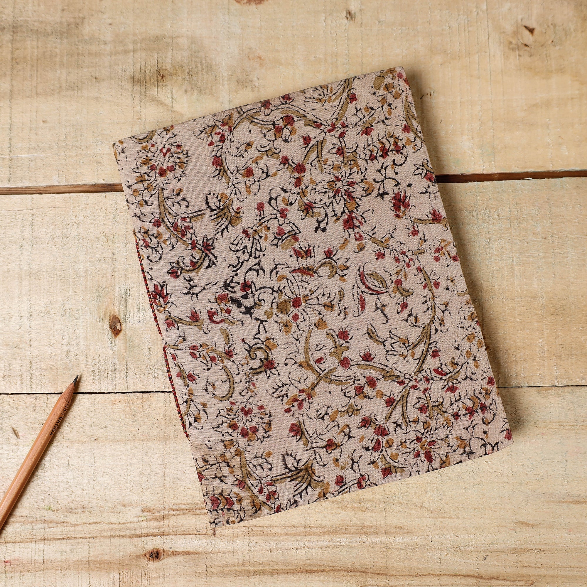 | Material | Beige kalamkari block printed cotton fabric embellished hard bound cover notebook with handmade papers. This paper is made of cotton, paper and other natural fibre waste recycled in an eco-friendly manner without the use of chemicals. Handmade by master artisans who maintain careful personal attention to detail. They are highly skilled in a variety of bookbinding and handmade stationery manufacturing techniques. |