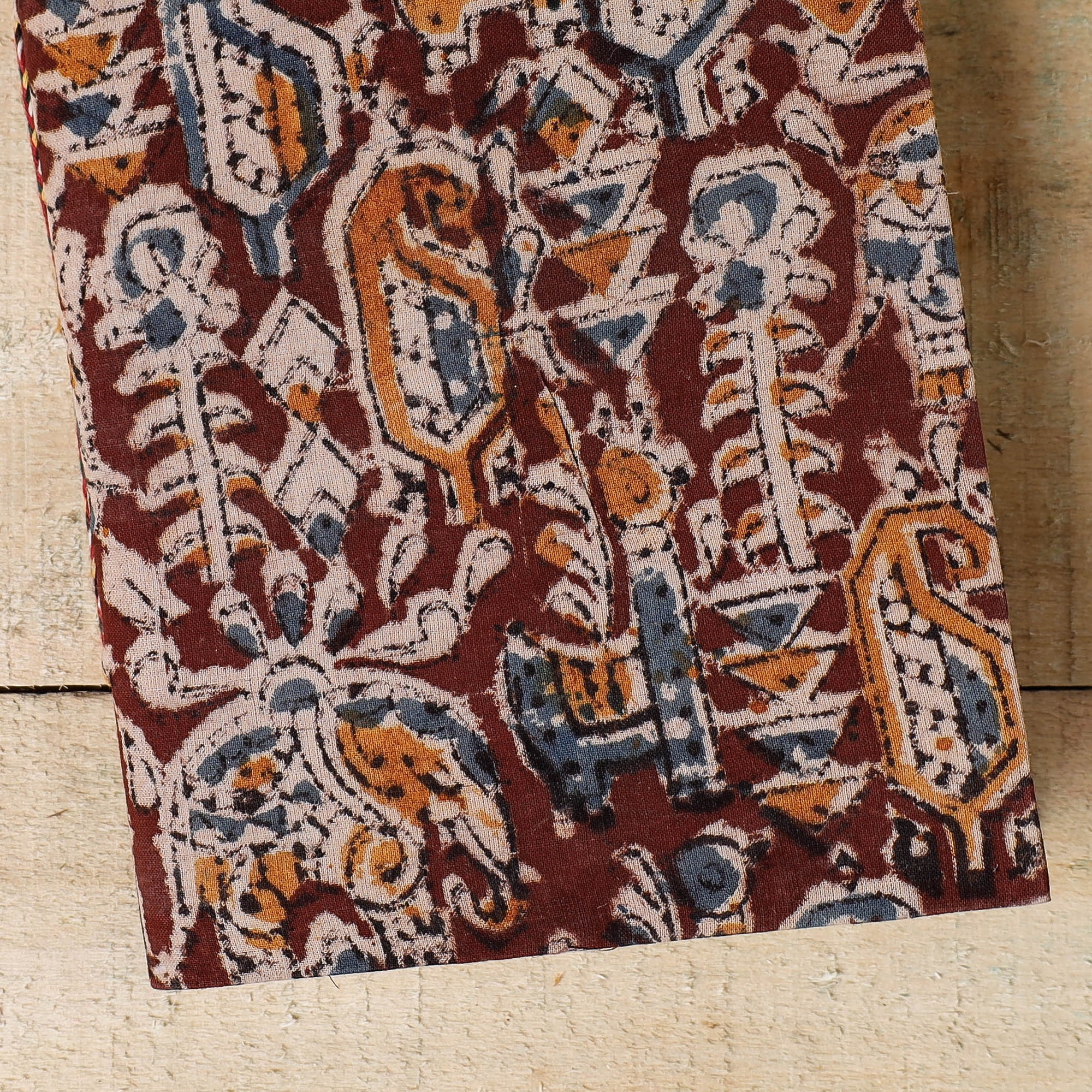 | Material | Maroon kalamkari block printed cotton fabric embellished hard bound cover notebook with handmade papers. This paper is made of cotton, paper and other natural fibre waste recycled in an eco-friendly manner without the use of chemicals. Handmade by master artisans who maintain careful personal attention to detail. They are highly skilled in a variety of bookbinding and handmade stationery manufacturing techniques. |
