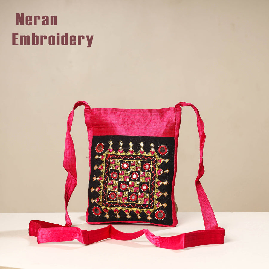 Pink neran embroidery done on this beautiful sling bag. Made up of mashru silk fabric with hand embroidered mirror work done by craftswoman in Kutch region of Gujarat. It has one zipper pocket outside. Artisanal Community : Sodha Rajput Traditionally cattle herders and agriculturists, they are the most recent migrants to Kutch. In this community, women wear an embroidered Choliand jacket after their marriage. Their embroidery style is mainly referred to as Pakko (which is predominantly used) and also comprises other stitches such as Neran, Kharek, Kambhiri. Their patterns are similar to that of Meghwar. Other than the embroidery, they do patch-work and applique. The Rajputs, who are historically the protector-warriors, as a community are conservative. The women of these clans are not allowed to go outside their faliya (colony). Embroidery is the only livelihood option for women of this densely populated community and hence comprises a fairly large share of Qasab’s creations.