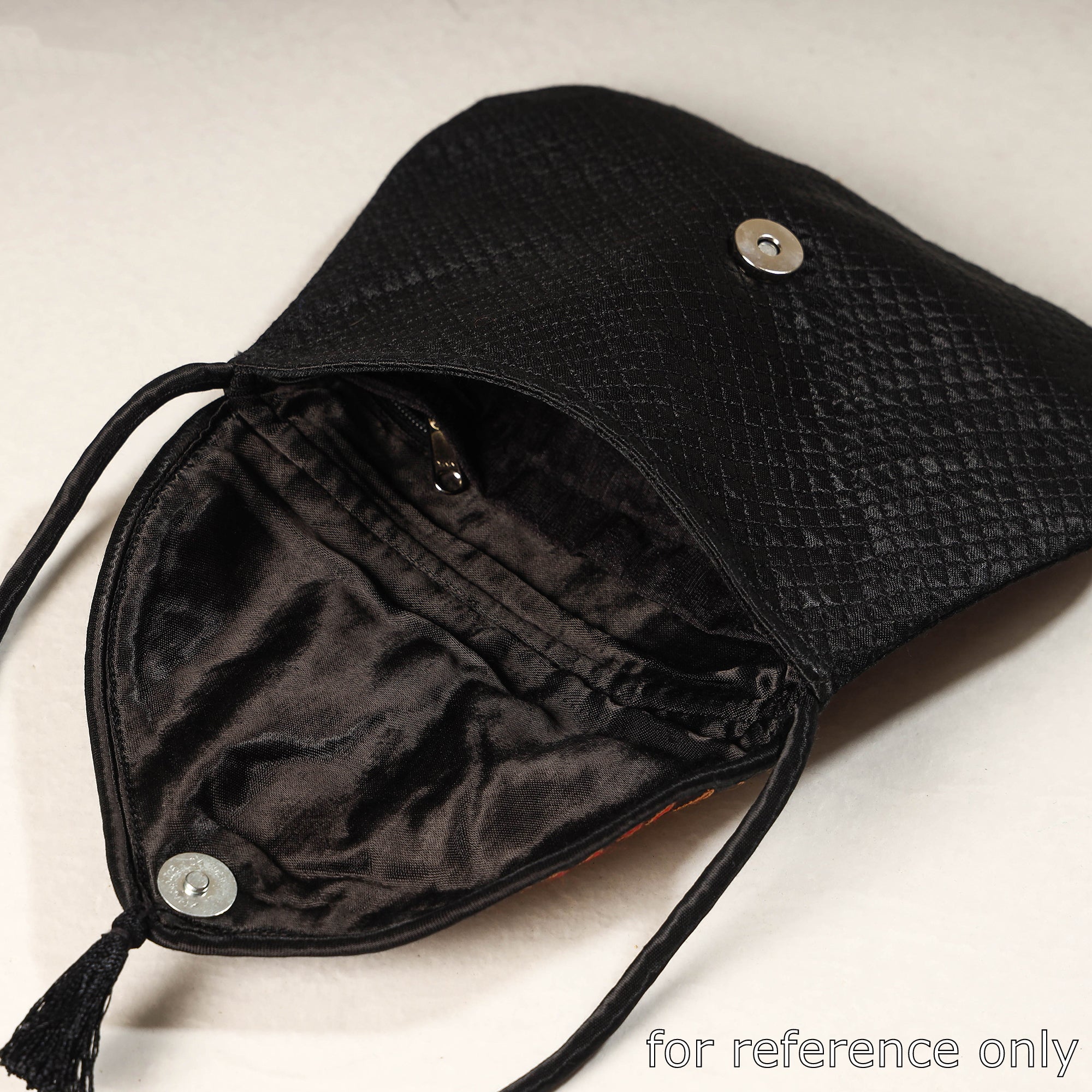 Pink ahir embroidery done on this beautiful hand bag. Made up of mashru silk fabric with hand embroidered mirror work done by craftswoman in Kutch region of Gujarat. It has one zipper pocket inside and ample space to keep most of your essentials.