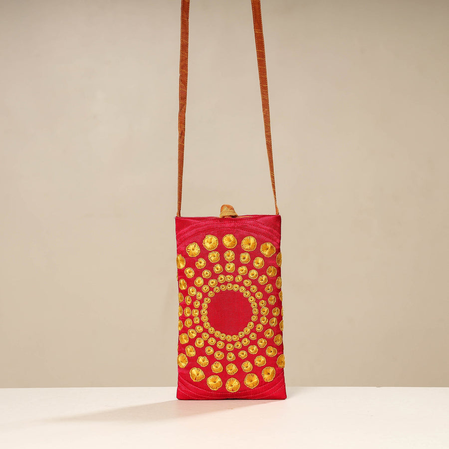 Kutch tappo embroidery done on this beautiful pink mobile sling bag. Made up of mashru silk fabric with hand embroidered done by craftswoman in Kutch region of Gujarat. It has one zipper pocket outside.