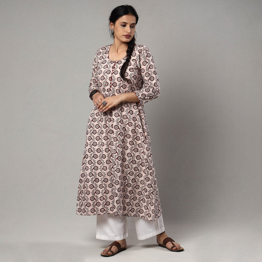 Look and feel beautiful in this uniquely designed beige block print cotton a-line bagh kurta with one side pocket. This cotton kurta makes you comfortable with ease all day long. This kurta is perfect for your daily outing and for a special occasion. Bagh is a hand block printing technique from the Bagh, a small tribal town in Dhar district of Madhya Pradesh. ‘Bagh prints’ are trendy, cool and comfortable cloth material.