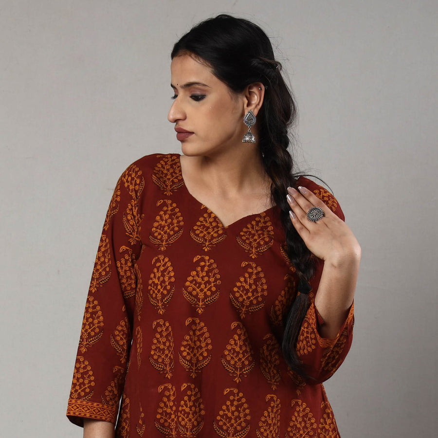Look and feel beautiful in this uniquely designed block print cotton a-line bagh kurta with one side pocket. This cotton kurta makes you comfortable with ease all day long. This kurta is perfect for your daily outing and for a special occasion. Bagh is a hand block printing technique from the Bagh, a small tribal town in Dhar district of Madhya Pradesh. ‘Bagh prints’ are trendy, cool and comfortable cloth material.