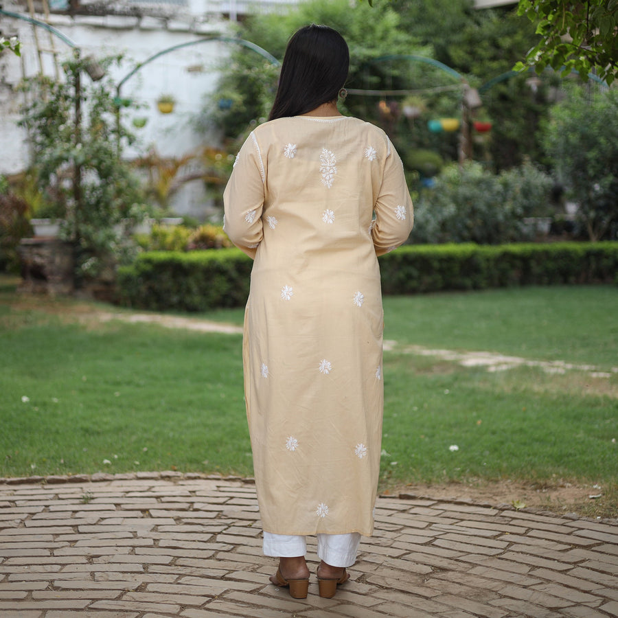 Intricate and artfully done lucknowi chikankari hand embroidery cotton kurta. Chikankari is a traditional textile decoration from Lucknow. It is very delicate and intricate hand embroidery work where thread is embroidered on cool, pastel shades of light cotton garments.