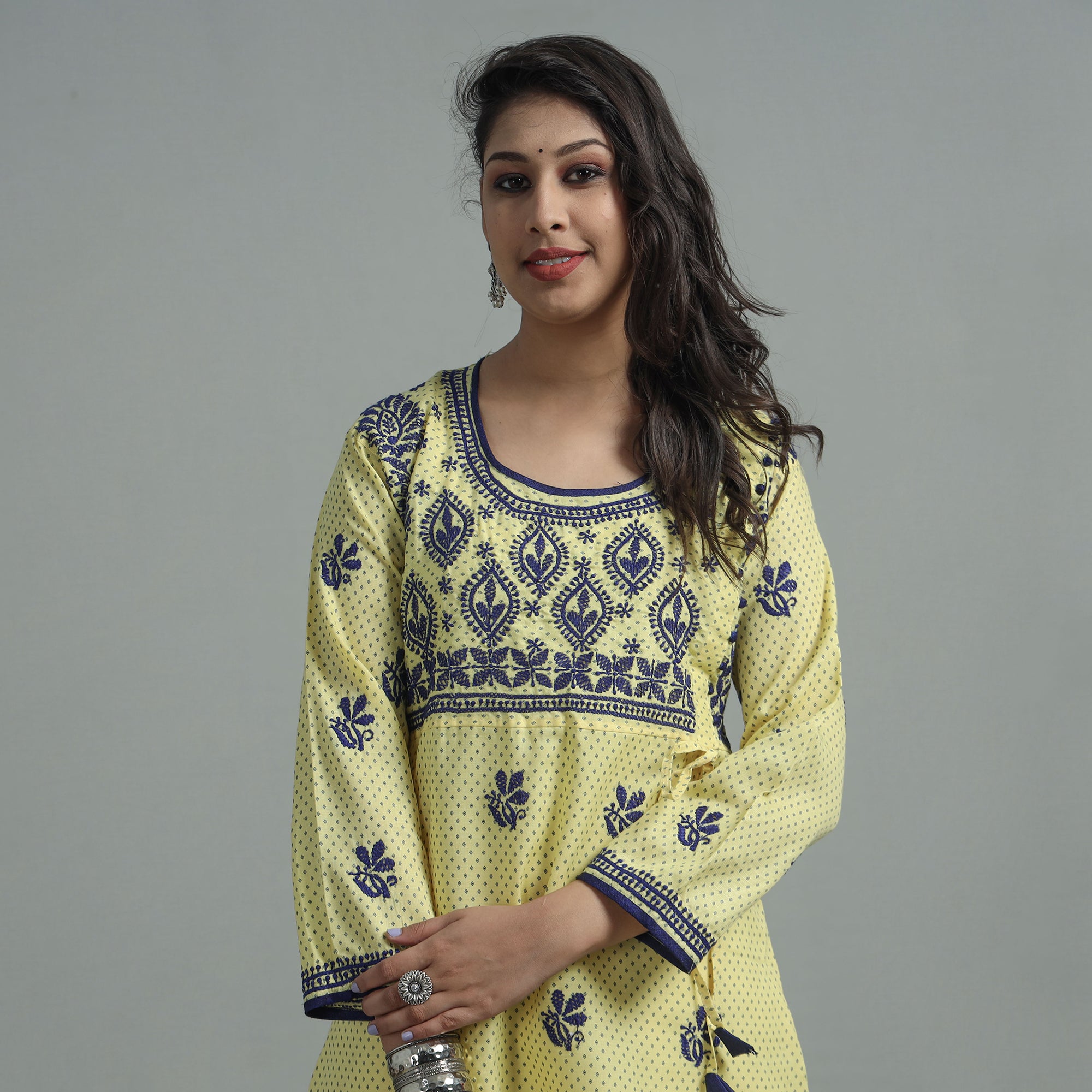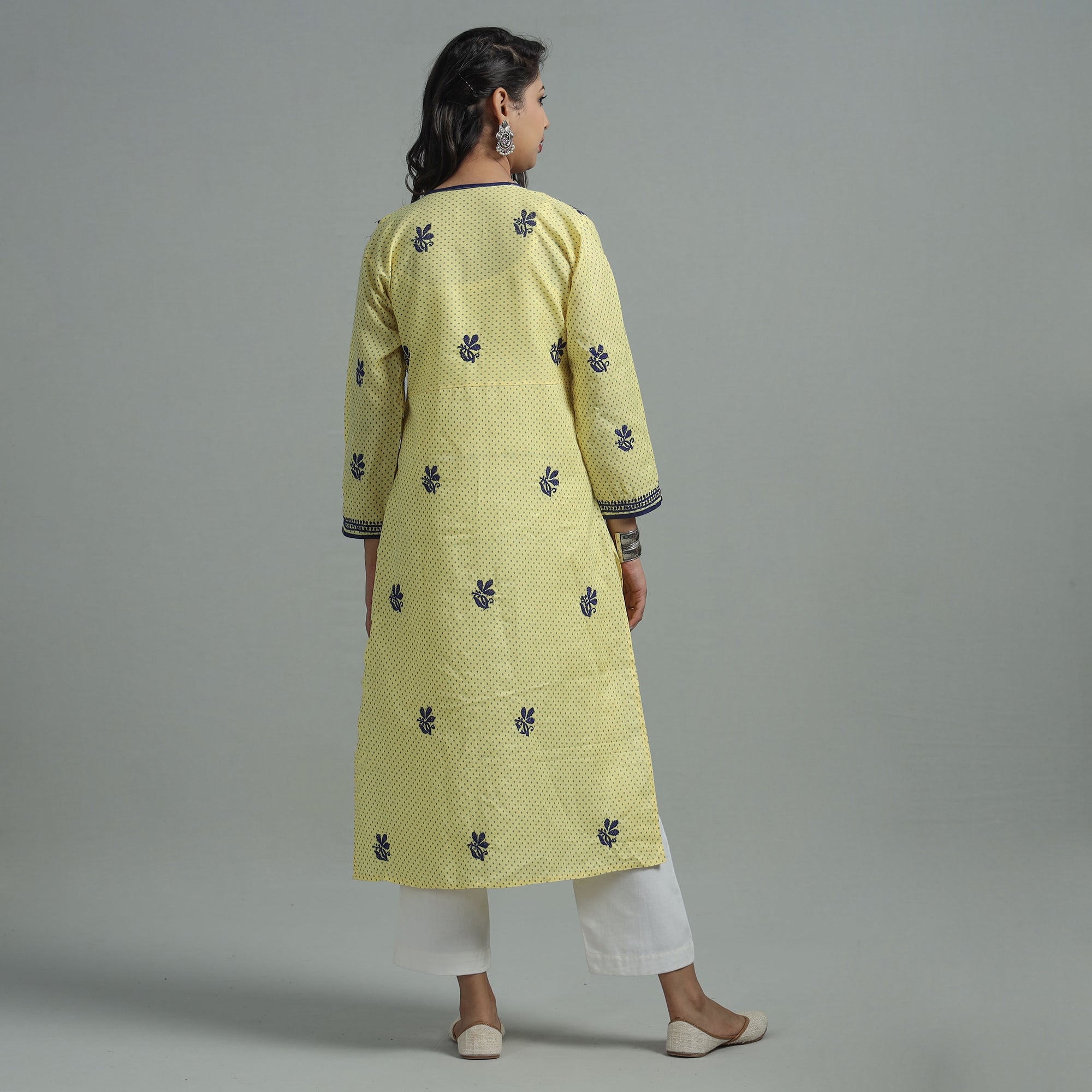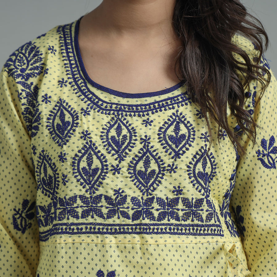 Intricate and artfully done lucknowi chikankari hand embroidery cotton kurta. Chikankari is a traditional textile decoration from Lucknow. It is very delicate and intricate hand embroidery work where thread is embroidered on cool, pastel shades of light cotton garments.