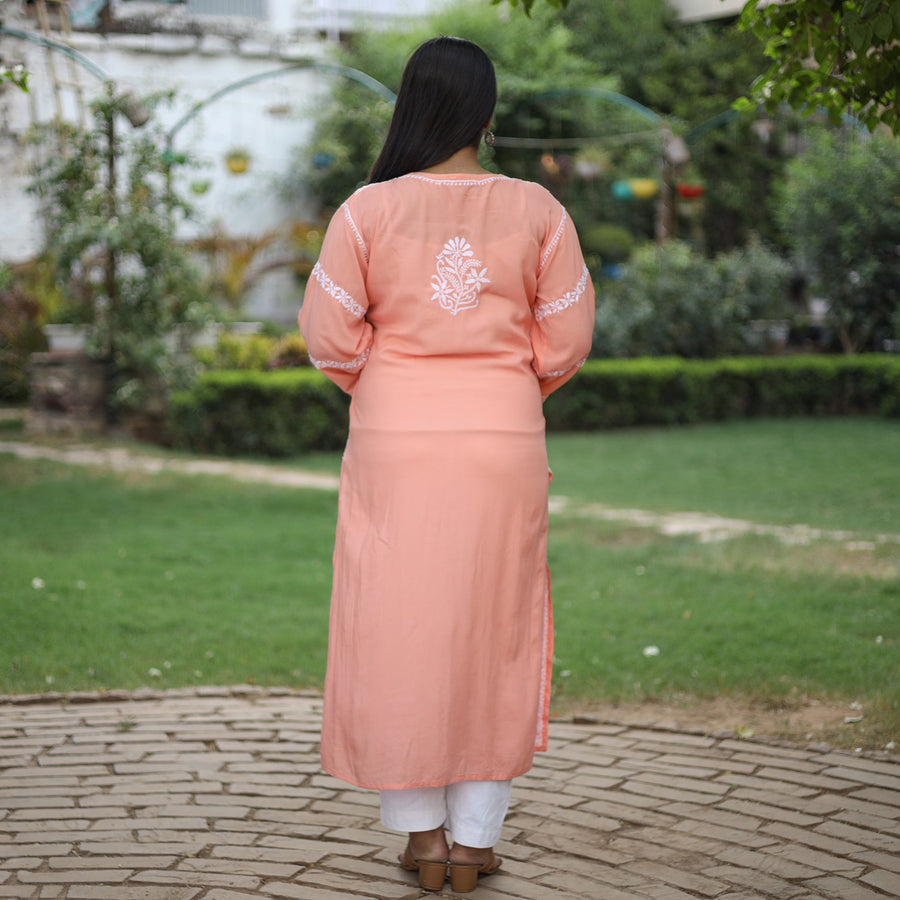 Intricate and artfully done lucknowi chikankari hand embroidery rayon cotton kurta. Chikankari is a traditional textile decoration from Lucknow. It is very delicate and intricate hand embroidery work where thread is embroidered on cool, pastel shades of light cotton garments.