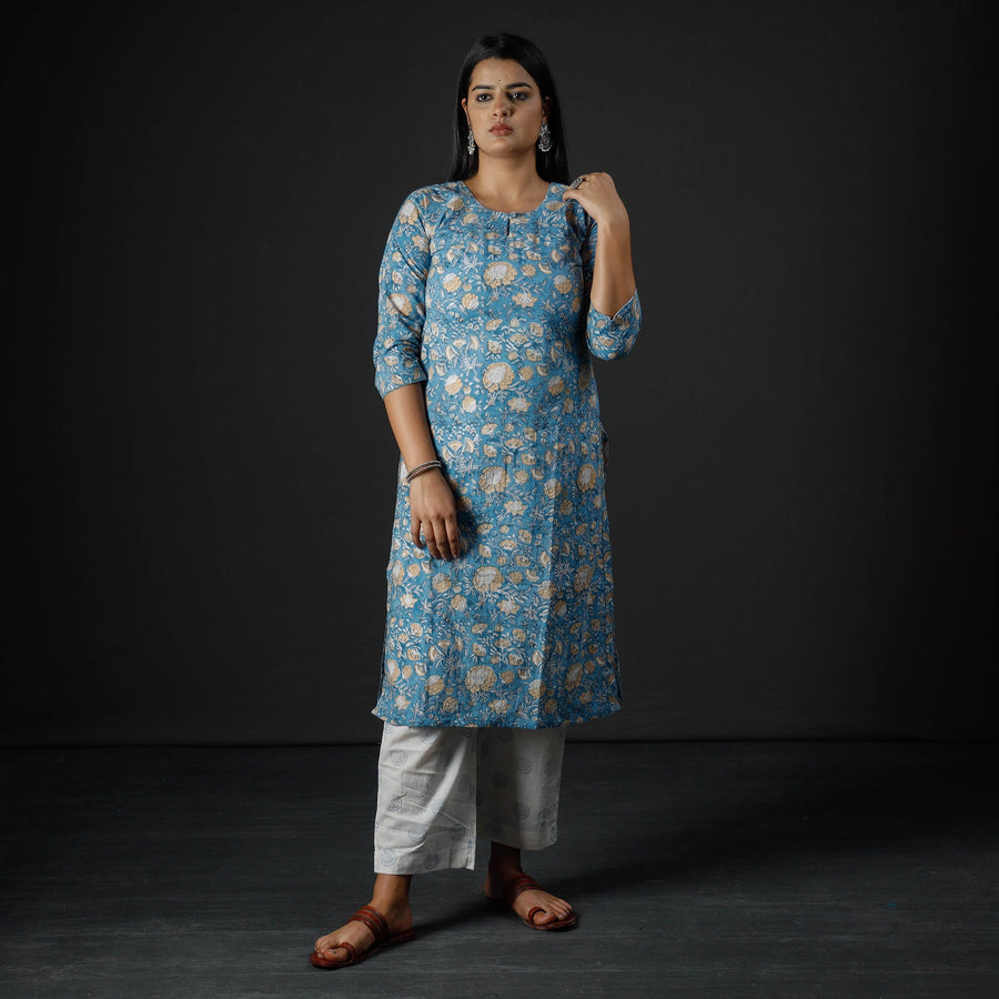 Look and feel beautiful in this uniquely designed sanganeri hand block printed cotton long Kurta with palazzo & dupatta set. This suit set contains a cotton kurta, palazzo, and mul cotton dupatta. The Kurta has one side pocket, and the palazzo has two side pockets. This cotton suit makes you comfortable with ease all day long. This suit is perfect for your daily outing and for a special occasion.
