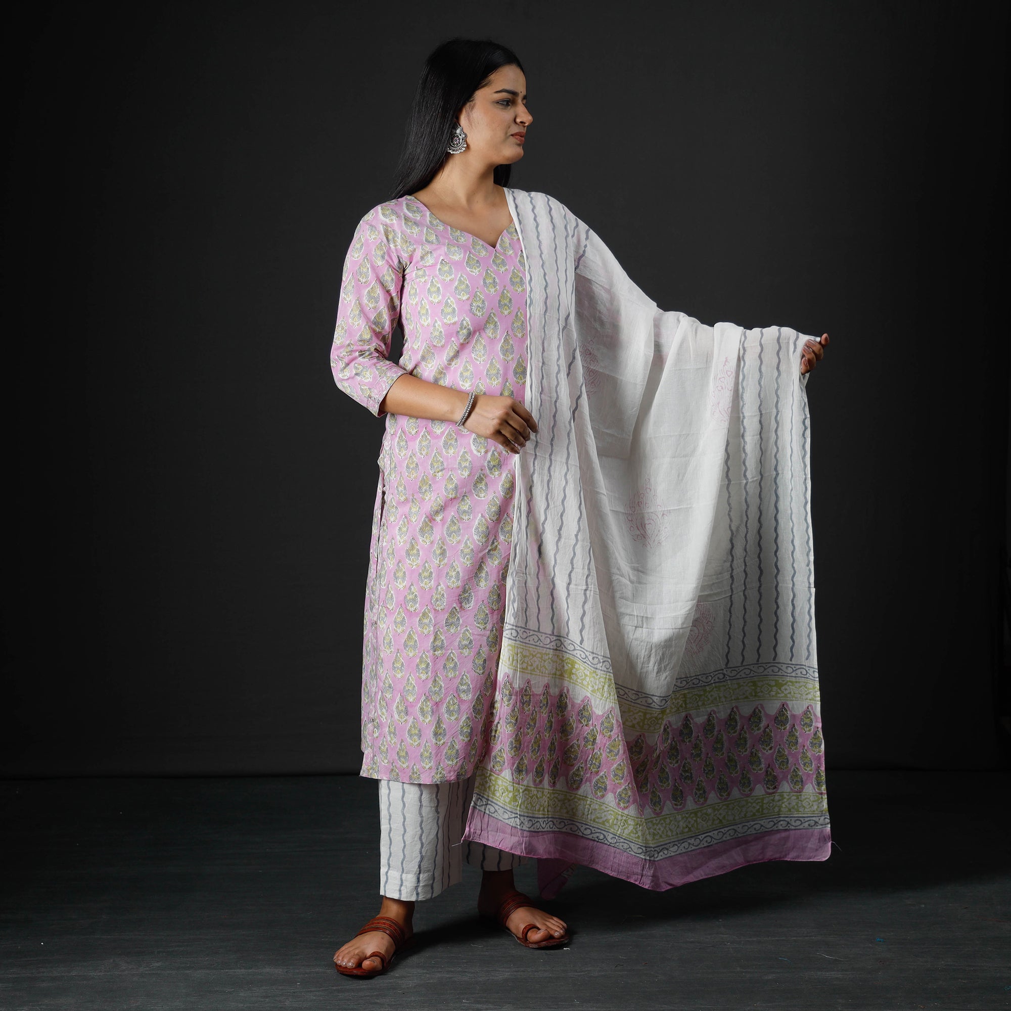•  Sanganeri Block Printed Cotton Kurta with Palazzo & Dupatta Set
