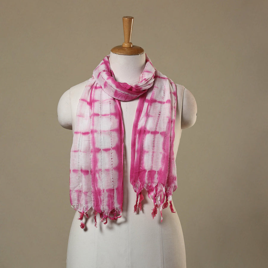 Fine quality pink shibori tie-dye pure cotton stole from Rajasthan. This stole is hand dyed using shibori tie and dye technique in which the fabric is tied using clamp or stitches in the required design and the pattern is dyed.
