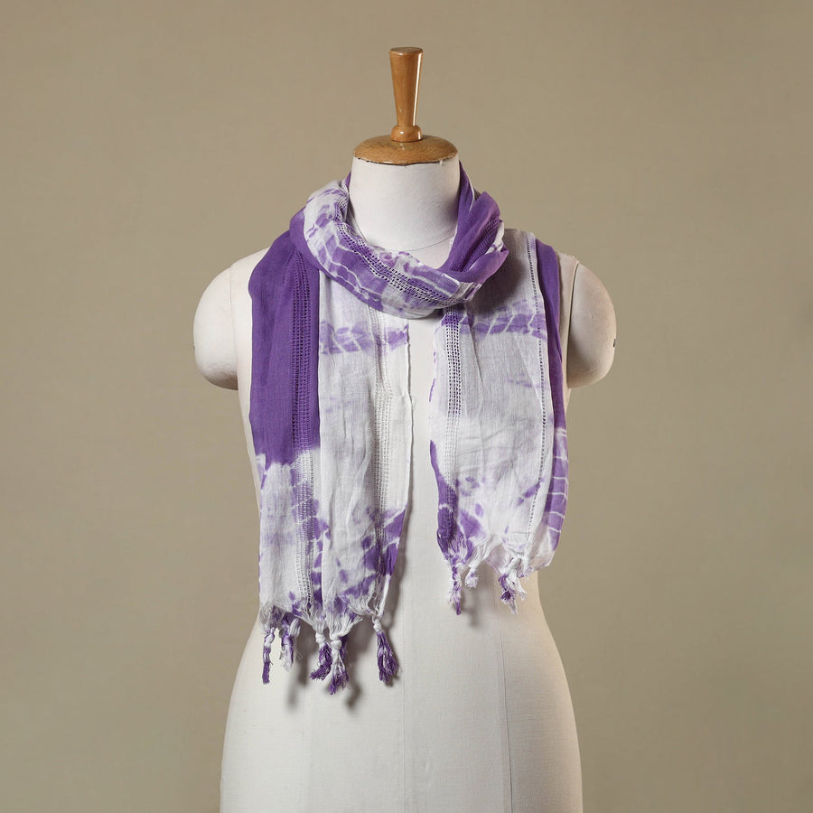 Fine quality purple shibori tie-dye pure cotton stole from Rajasthan. This stole is hand dyed using shibori tie and dye technique in which the fabric is tied using clamp or stitches in the required design and the pattern is dyed.