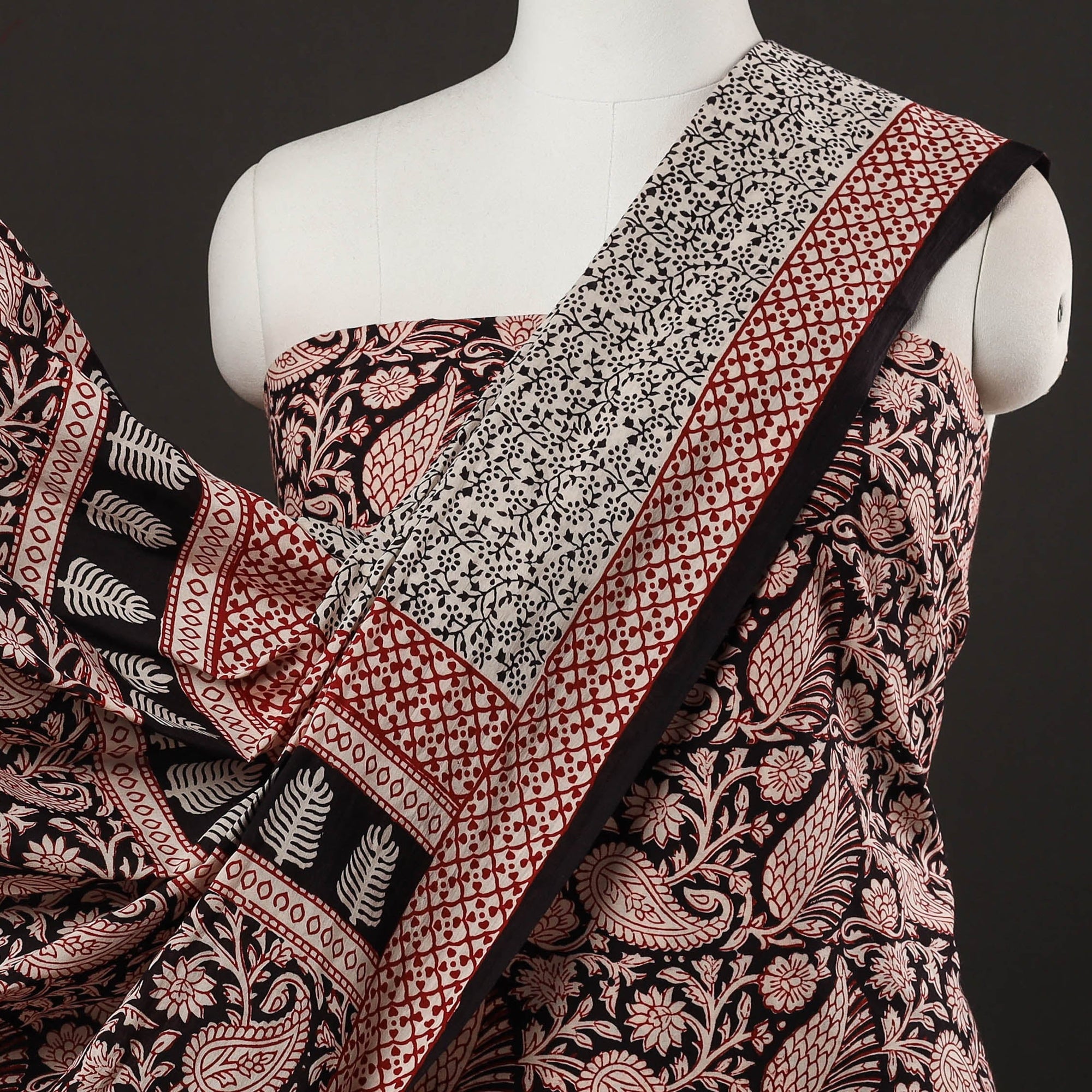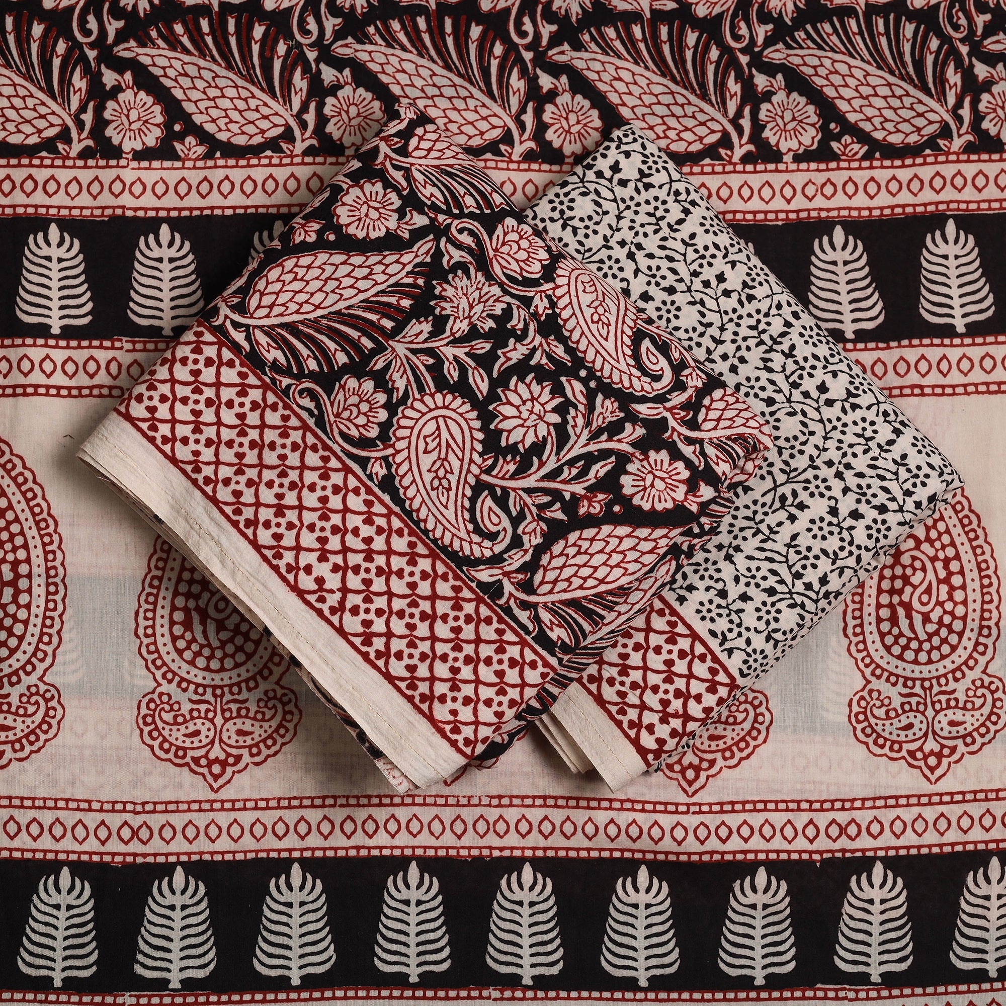 Fine quality black bagh hand block printing cotton suit material with mul cotton dupatta made using natural dyes through traditional processes by master artisan Umar Faruk Khatri practiced in Bagh, the Dhar district of Madhya Pradesh.