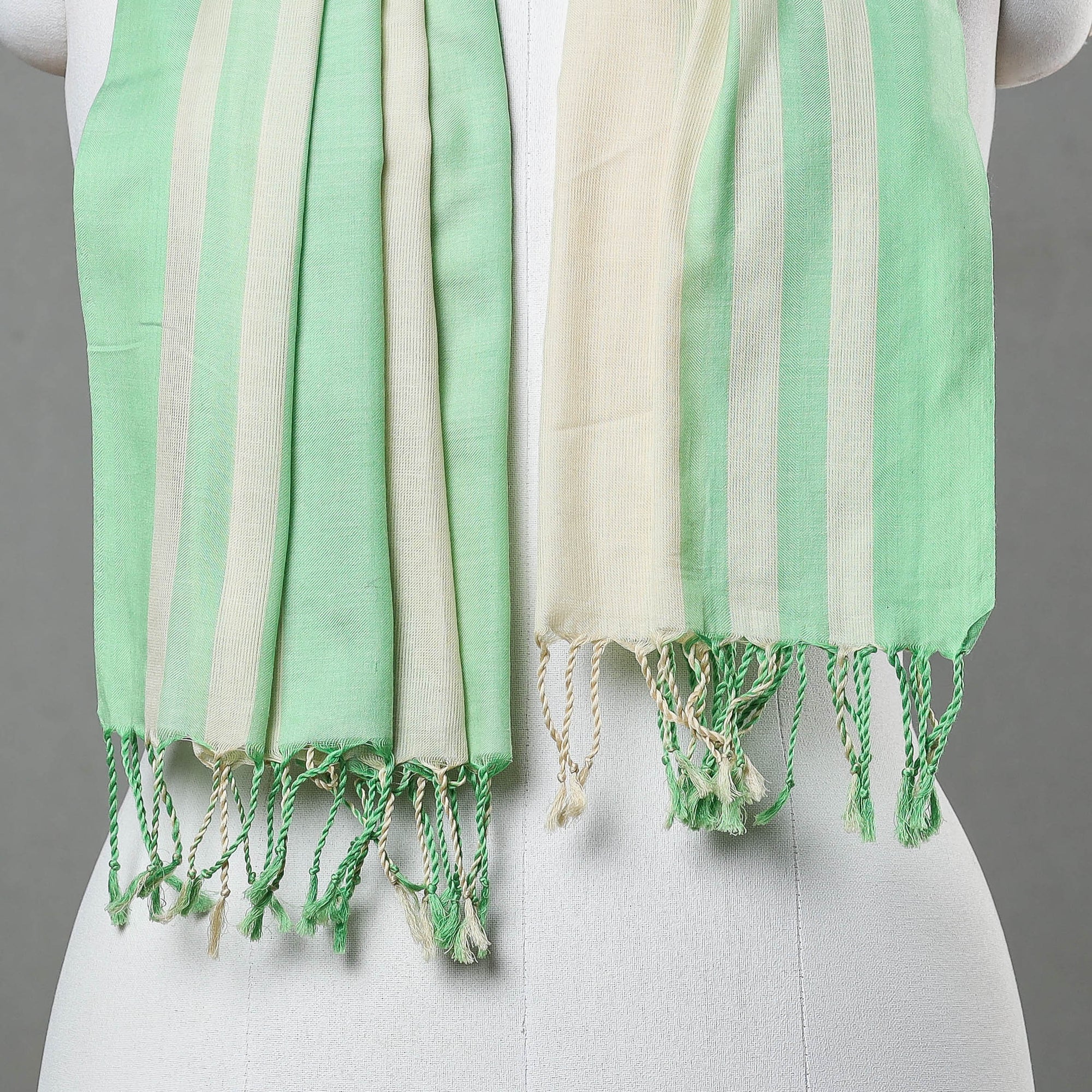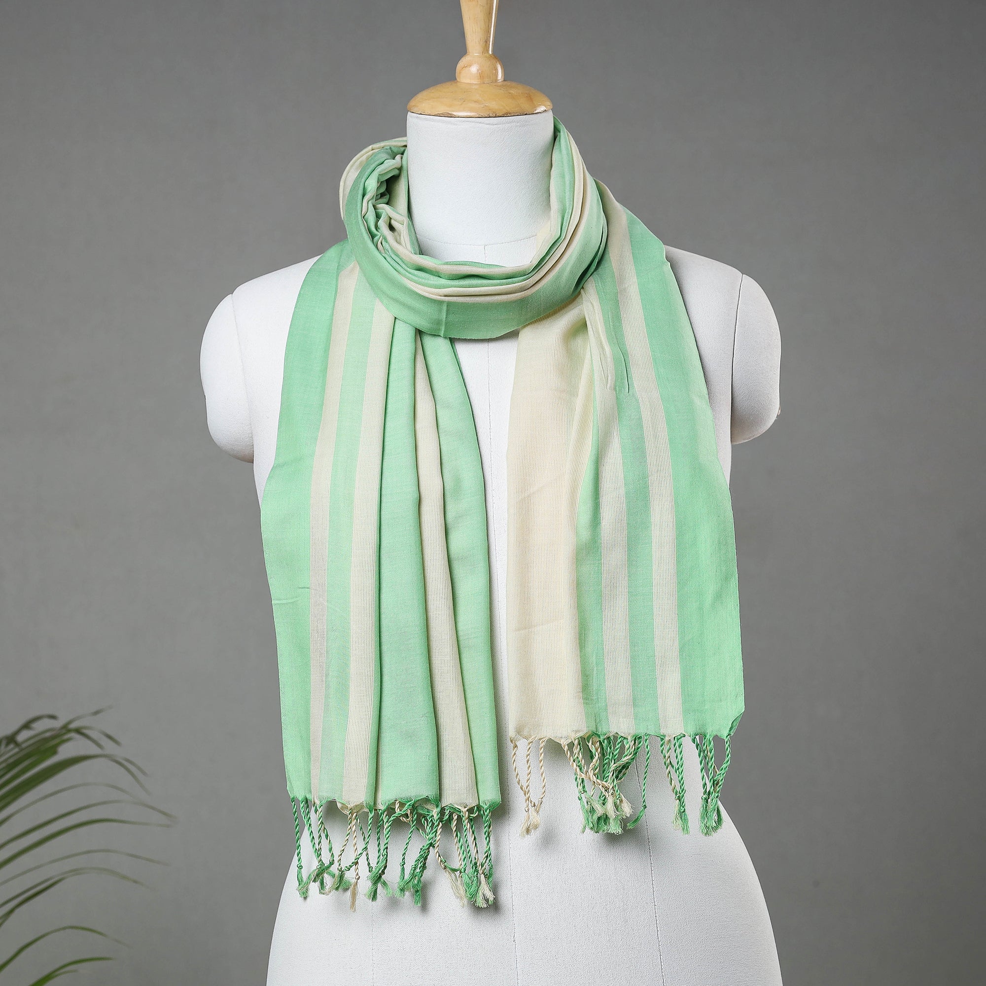 This Maheshwari handloom cotton stole, skillfully woven by master-weaver from Maheshwar, showcases the traditional craftsmanship of the region. Made from fine pure cotton, this stole features a lightweight and sheer texture that exudes grace and elegance. Adorned with tassels, it adds a touch of sophistication to any outfit. The weaving tradition has been passed down through generations in master-weaver's family, making this stole a true testament to the rich heritage and expertise of Maheshwari handloom weaving.
