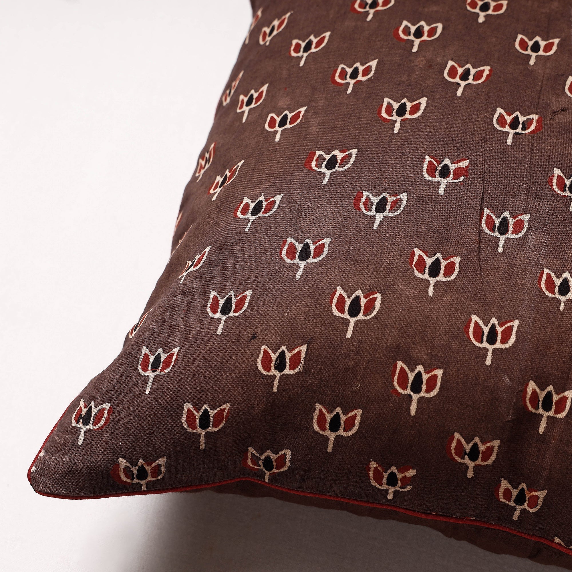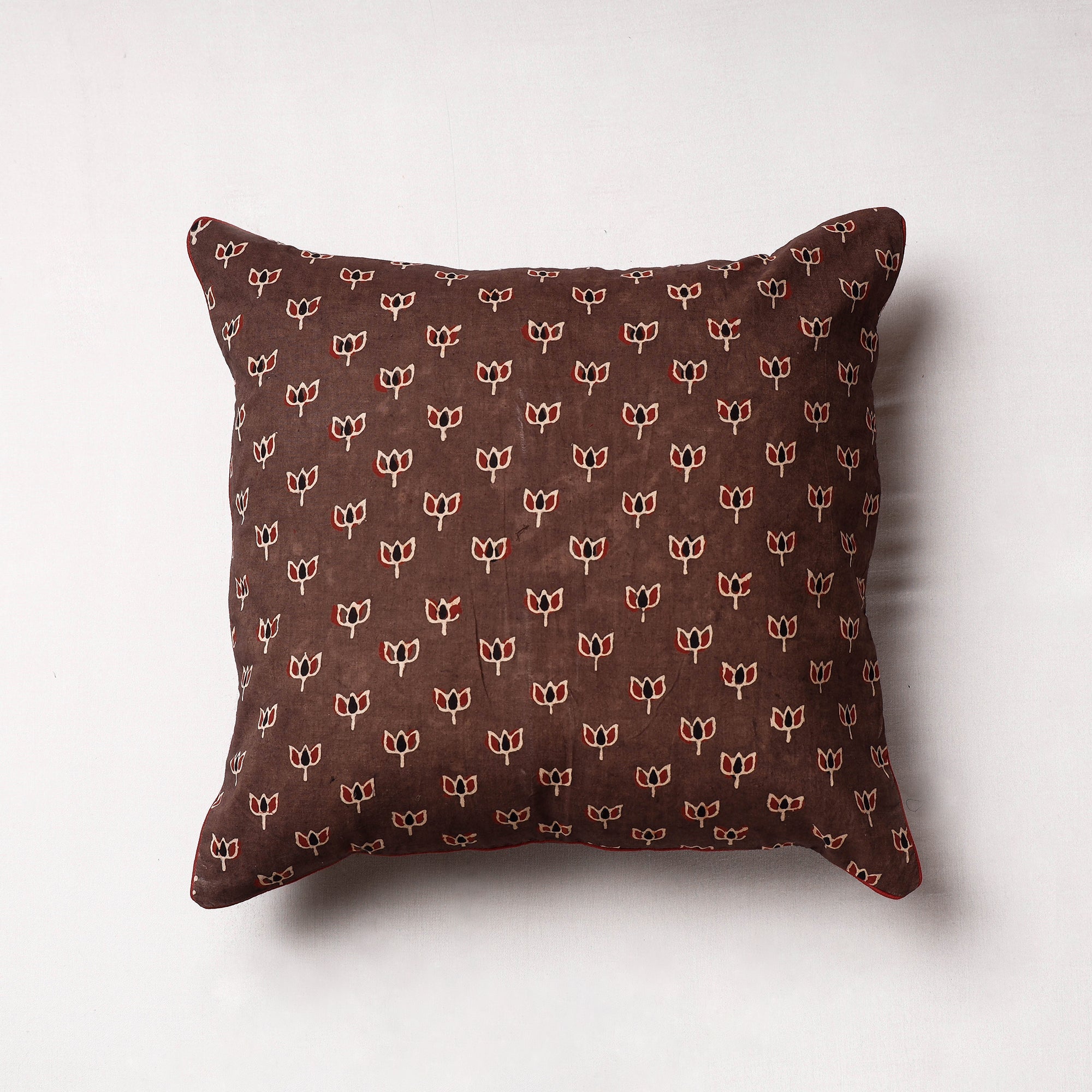 Fine quality ajrakh block printing cotton cushion cover, made using natural dyes through traditional ajrakh technique of hand block printing practised in Kutch region of Gujarat.