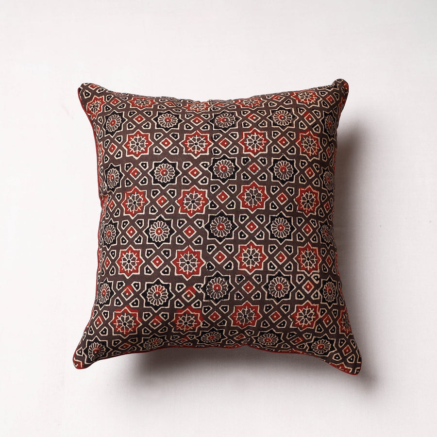 Fine quality ajrakh block printed cotton cushion cover, made using natural dyes through traditional ajrakh technique of hand block printing practised in Kutch region of Gujarat.