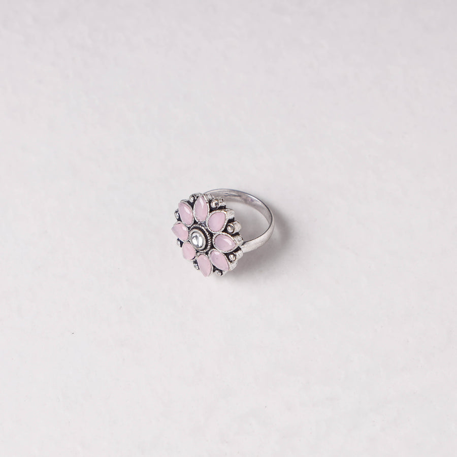 Antique silver finish oxidised brass base stone work necklace set with ring, made of high quality oxidised metal with rustic shine effect.