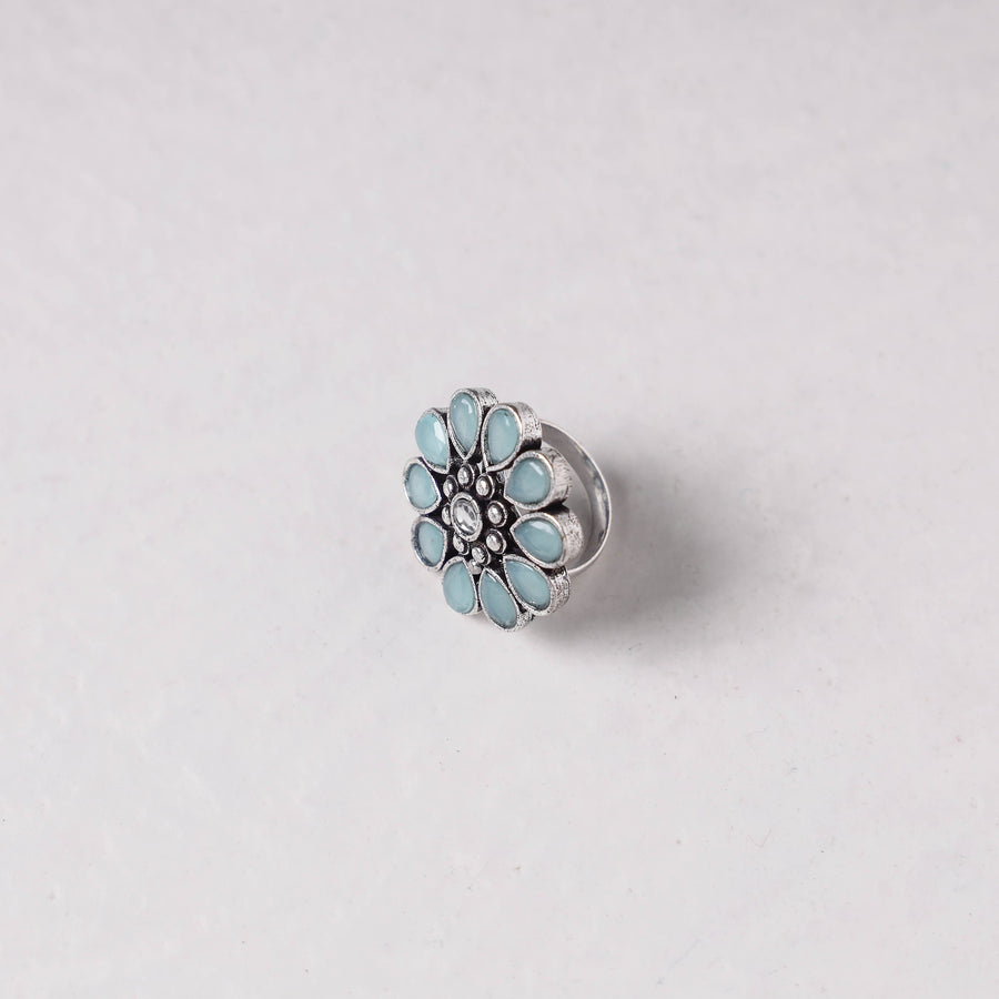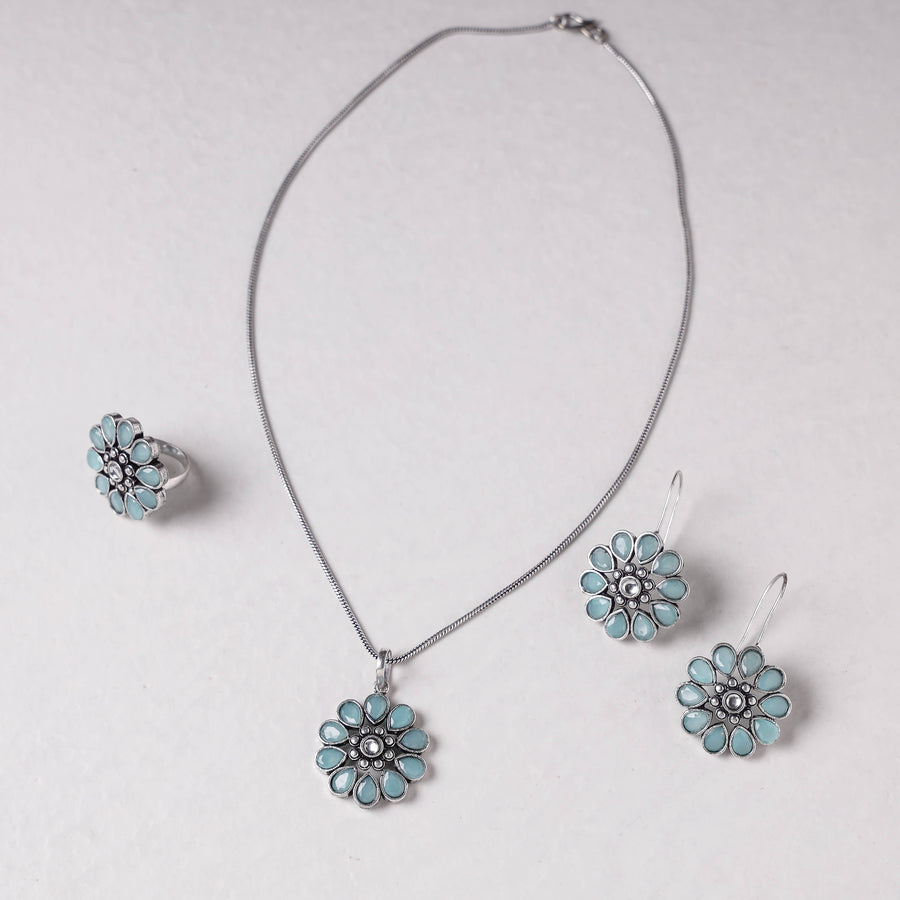 Blue antique silver finish oxidised brass base stone work necklace set with ring, made of high quality oxidised metal with rustic shine effect.