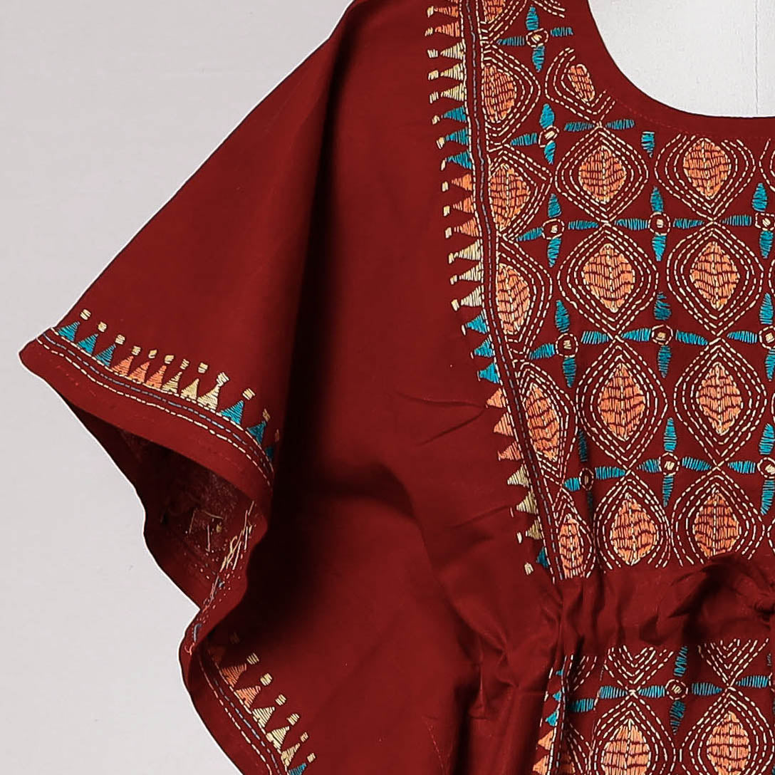 Fine quality bengal kantha hand embroidered pure cotton long kaftan. A traditional kaftan or caftan is an ankle-length garment with long, flowing sleeves. It has an adjustable drawstring waist. This loose-fitting cotton kaftan is designed with contemporary patterns & has been hand embroidered using West Bengal's traditional craft technique of Kantha. This dress will allow you to move with ease and comfort. The drawstring waist tie will give you the freedom to customize the fit to suit your unique shape.