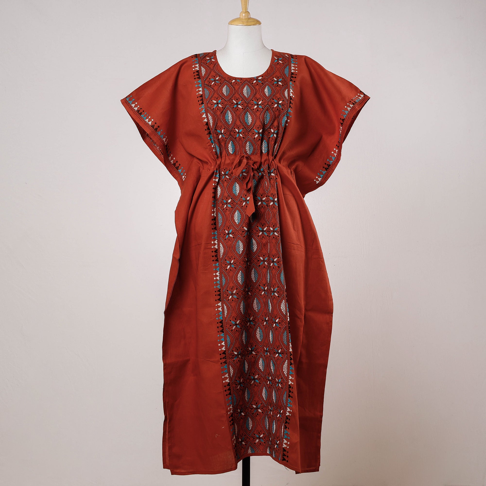Fine quality bengal kantha hand embroidered pure cotton long kaftan. A traditional kaftan or caftan is an ankle-length garment with long, flowing sleeves. It has an adjustable drawstring waist. This loose-fitting cotton kaftan is designed with contemporary patterns & has been hand embroidered using West Bengal's traditional craft technique of Kantha. This dress will allow you to move with ease and comfort. The drawstring waist tie will give you the freedom to customize the fit to suit your unique shape.