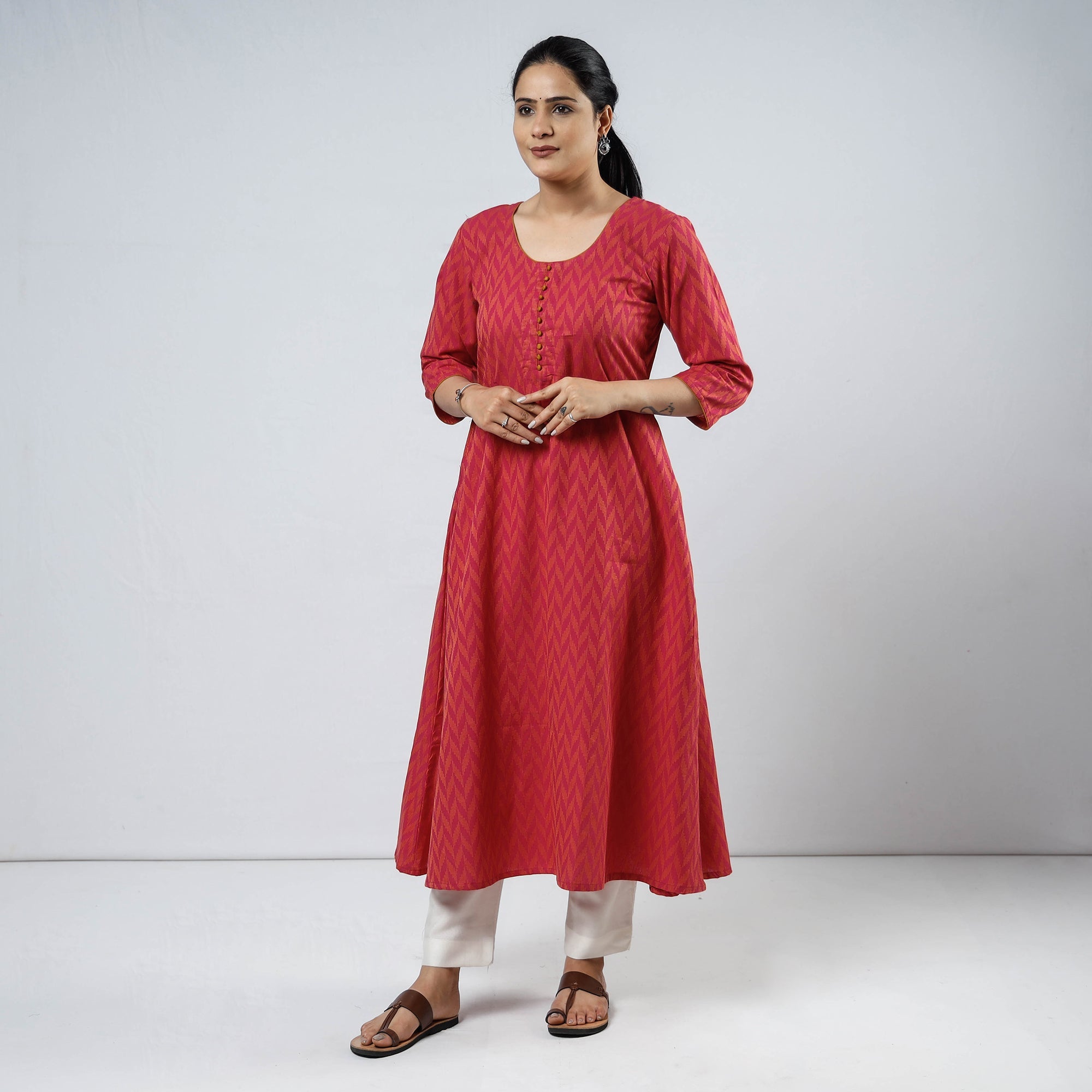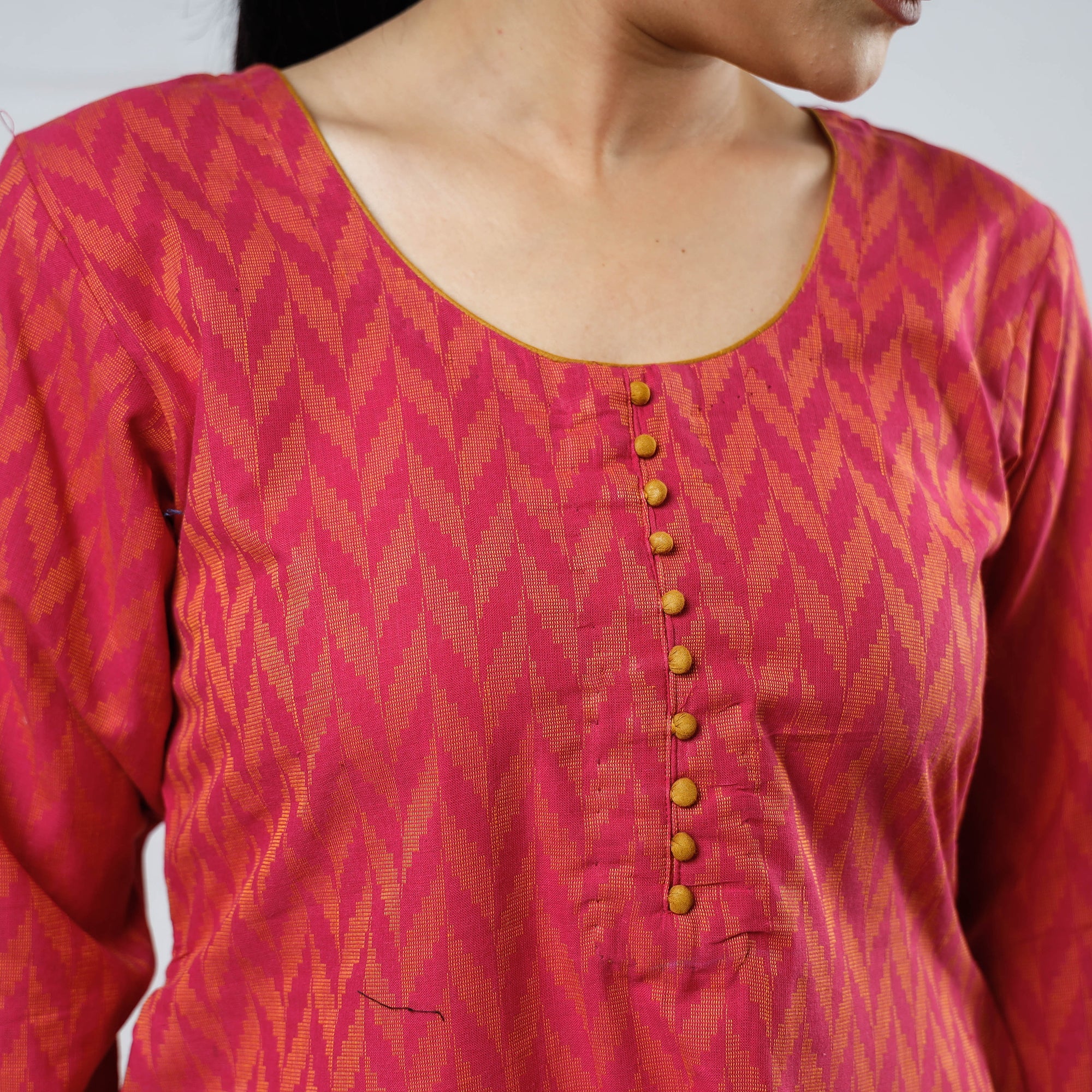Step into elegance with this cotton a-line jacquard kurta, designed for all-day comfort and style. Featuring a breathable cotton fabric and a convenient side pocket, this a-line kurta blends traditional weaving with modern aesthetics. Jacquard weaving, renowned for its intricate motifs, lends a sophisticated texture to your wardrobe.