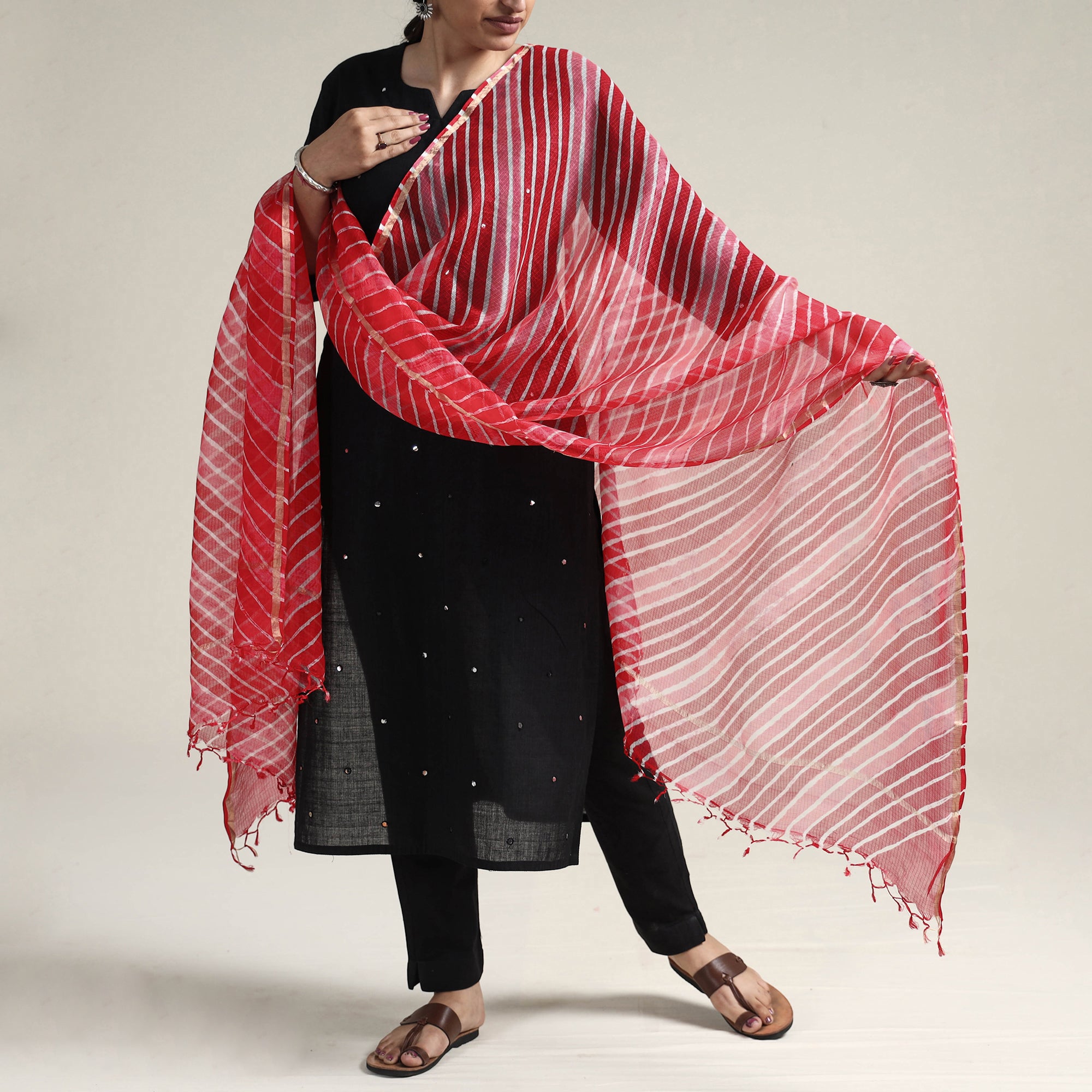 Traditional pink leheriya tie-dye kota doria silk dupatta with tassels. Azo free dye has been used to make this dupatta. The wavy patterns on this dupatta has been dyed using leheriya tie & dye technique through traditional process by master artisan family of Badshah Miyan from the state of Rajasthan. (tassels along the border).