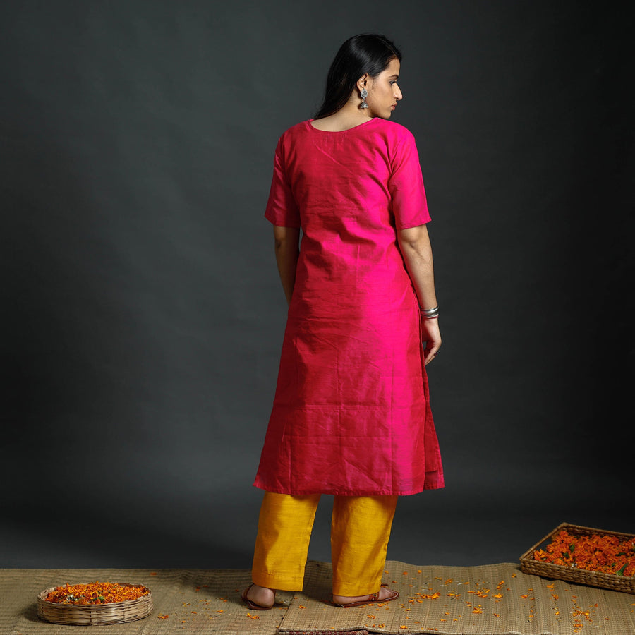 Look and feel beautiful in this uniquely designed phulia jamdani handloom silk-cotton side pocket long kurta with palazzo & dupatta set. This silk-cotton suit makes you comfortable with ease all day long. This suit is perfect for your special occasion.