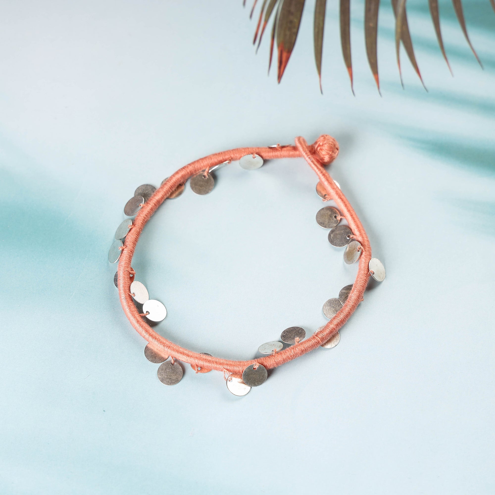 This peach patwa anklet is made from thick weaves of thread with sequin work, handcrafted by the master craftsmen Kailash Patwa. Patwa is a thread craft that originated in Rajasthan and is now practised in parts of the state. Patwa is derived from the Hindi word 'pat,' which means silk, and those involved in the silk and cotton thread business are known as Patwas.