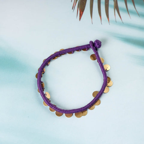 This purple patwa anklet is made from thick weaves of thread with sequin work, handcrafted by the master craftsmen Kailash Patwa. Patwa is a thread craft that originated in Rajasthan and is now practised in parts of the state. Patwa is derived from the Hindi word 'pat,' which means silk, and those involved in the silk and cotton thread business are known as Patwas.
