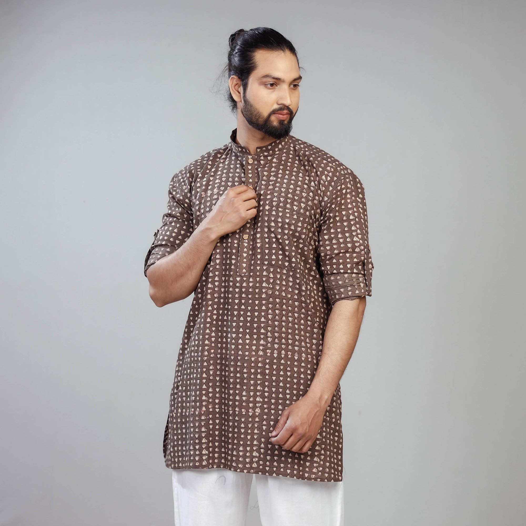 | Material | Fine quality akola block printed cotton men's short kurta, made using naturally dyed fabric through the traditional mud resist process of hand block printing practised by the master artisans in Akola village of Rajasthan. This kurta features a stand collar, full sleeves, a front button placket, crisp wooden buttons, and a patch pocket on the front. It is the perfect addition to your casual wardrobe. |