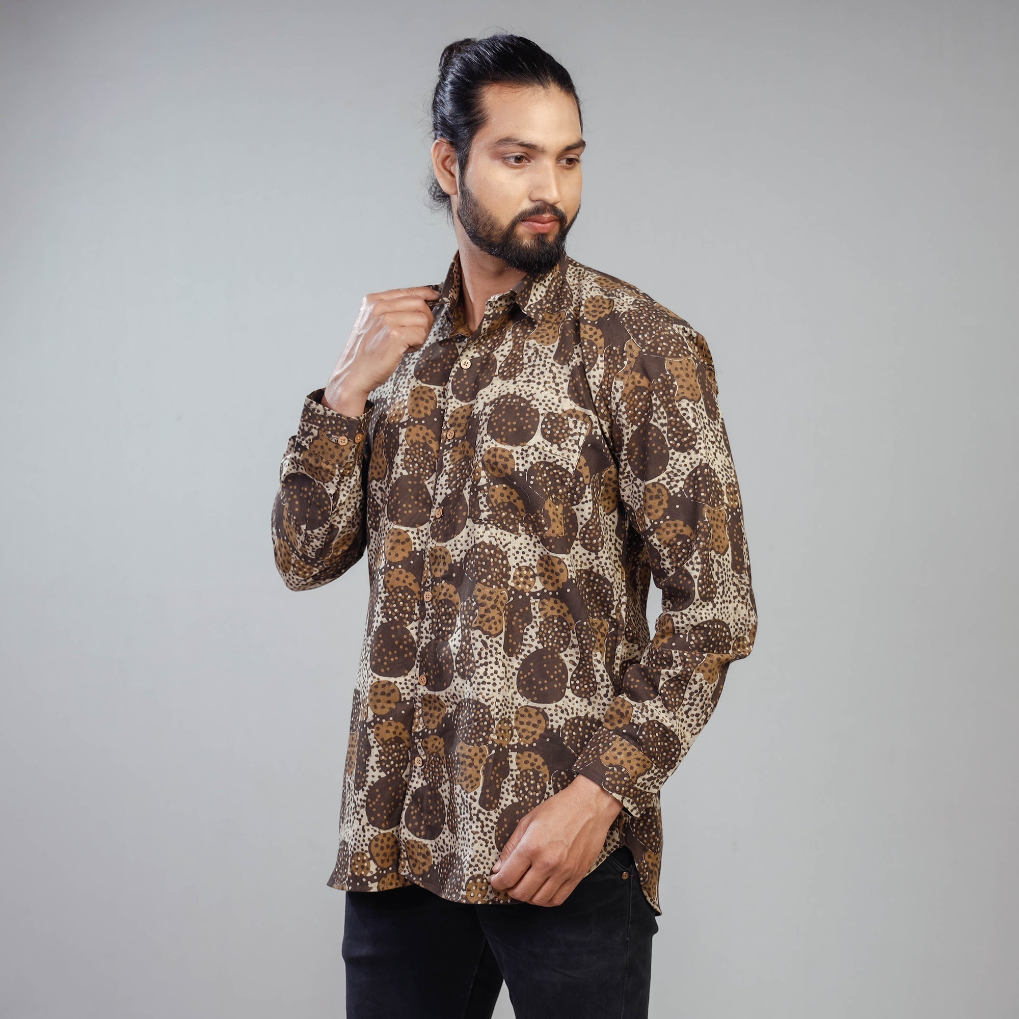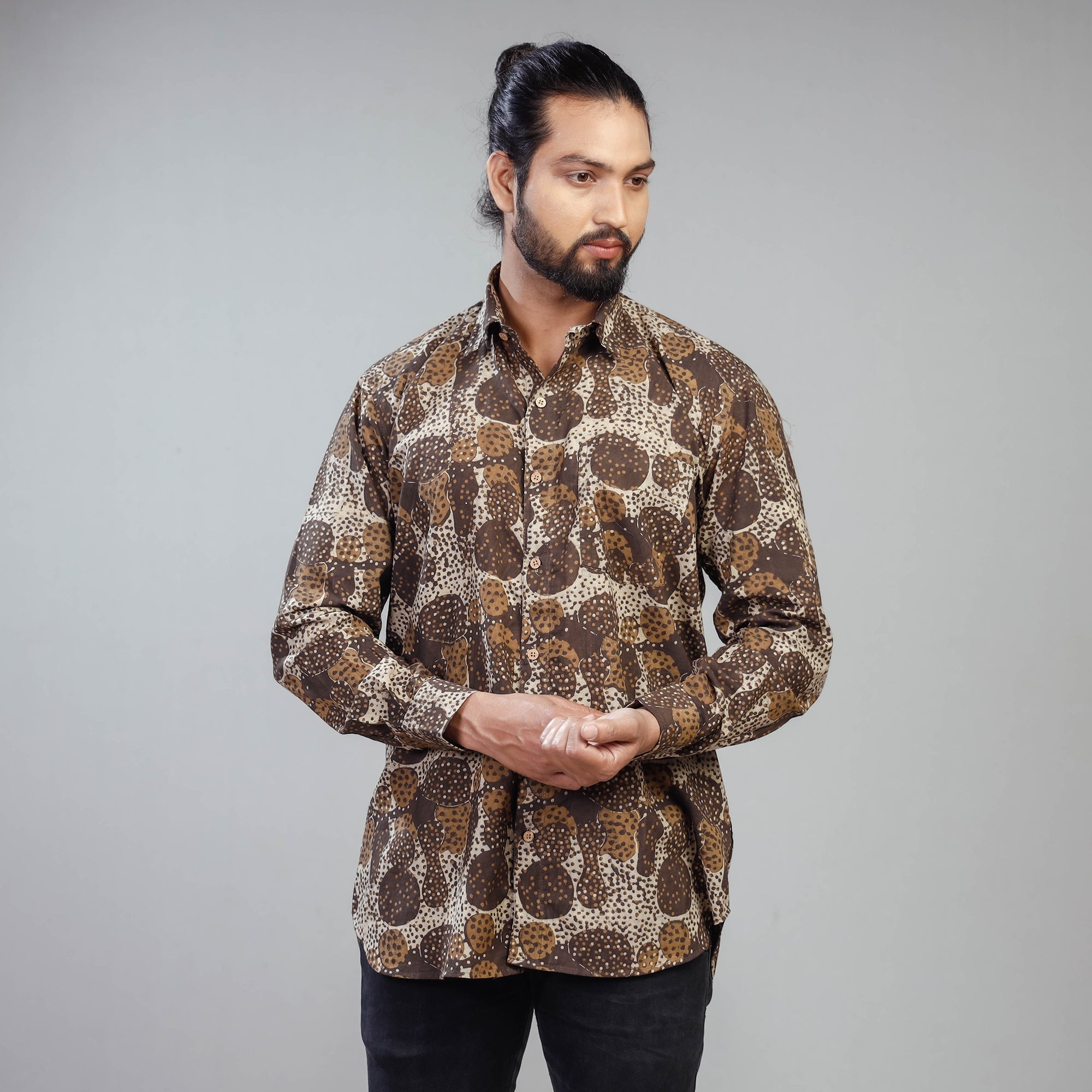 Fine quality akola block printing cotton men's full-sleeve shirt, made using naturally dyed fabric through the traditional mud resist process of hand block printing practised by the master artisans in Akola village of Rajasthan. This shirt features a regular collar, full sleeves, crisp wooden buttons, and a patch pocket on the front. It is the perfect addition to your casual wardrobe.