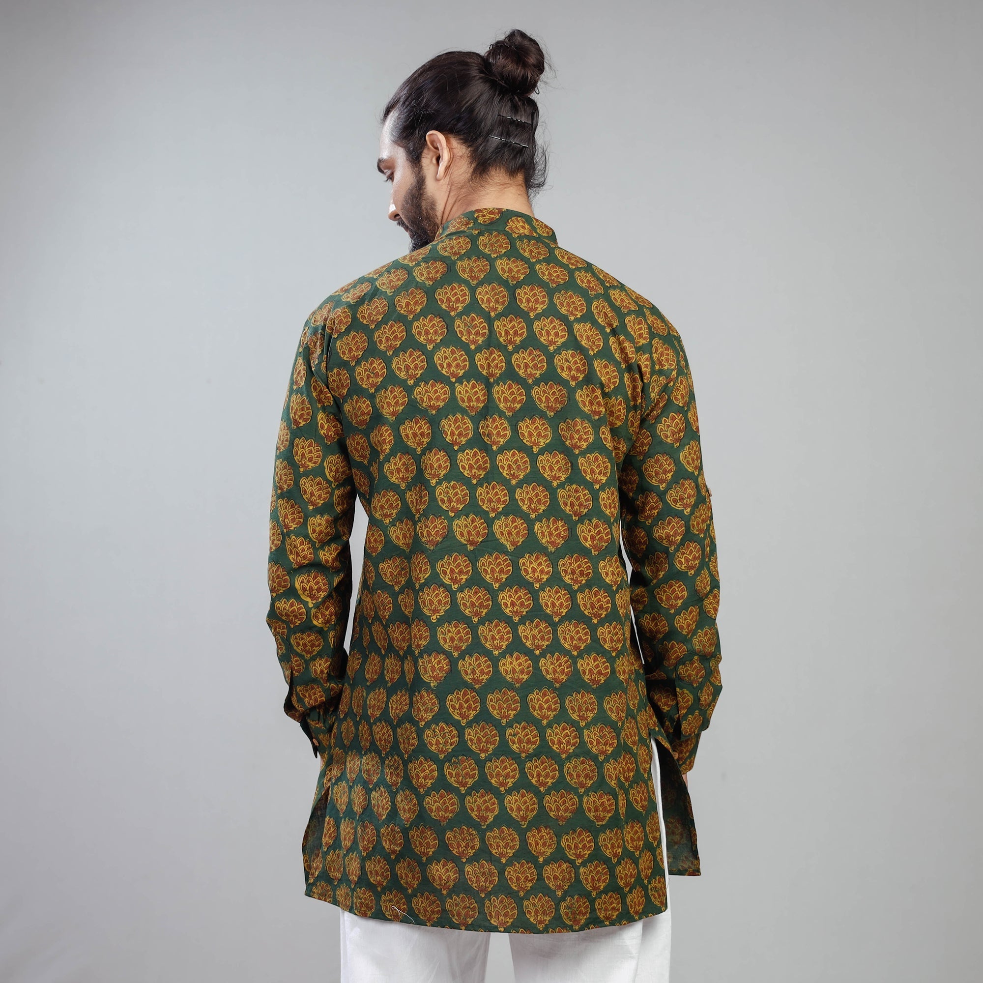 Fine quality green akola block printed cotton men's short kurta, made using naturally dyed fabric through the traditional mud resist process of hand block printing practised by the master artisans in Akola village of Rajasthan. This kurta features a stand collar, full sleeves, a front button placket, crisp wooden buttons, and a patch pocket on the front. It is the perfect addition to your casual wardrobe.