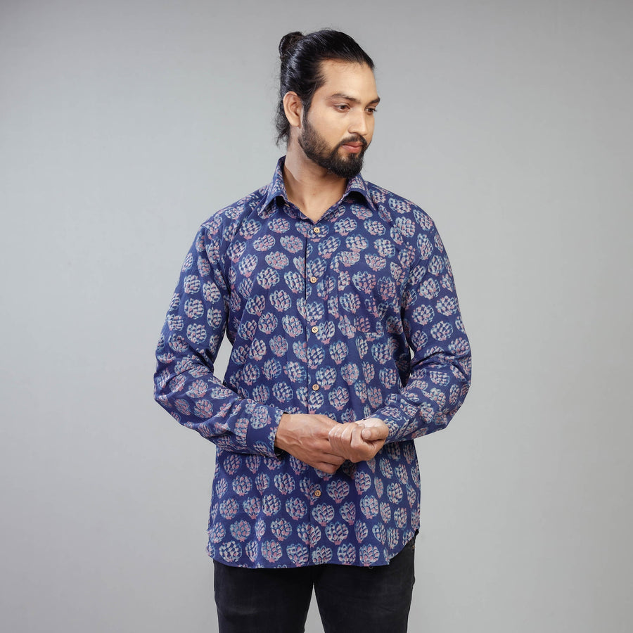 Fine quality akola block printing cotton men's full-sleeve shirt, made using naturally dyed fabric through the traditional mud resist process of hand block printing practised by the master artisans in Akola village of Rajasthan. This shirt features a regular collar, full sleeves, crisp wooden buttons, and a patch pocket on the front. It is the perfect addition to your casual wardrobe.