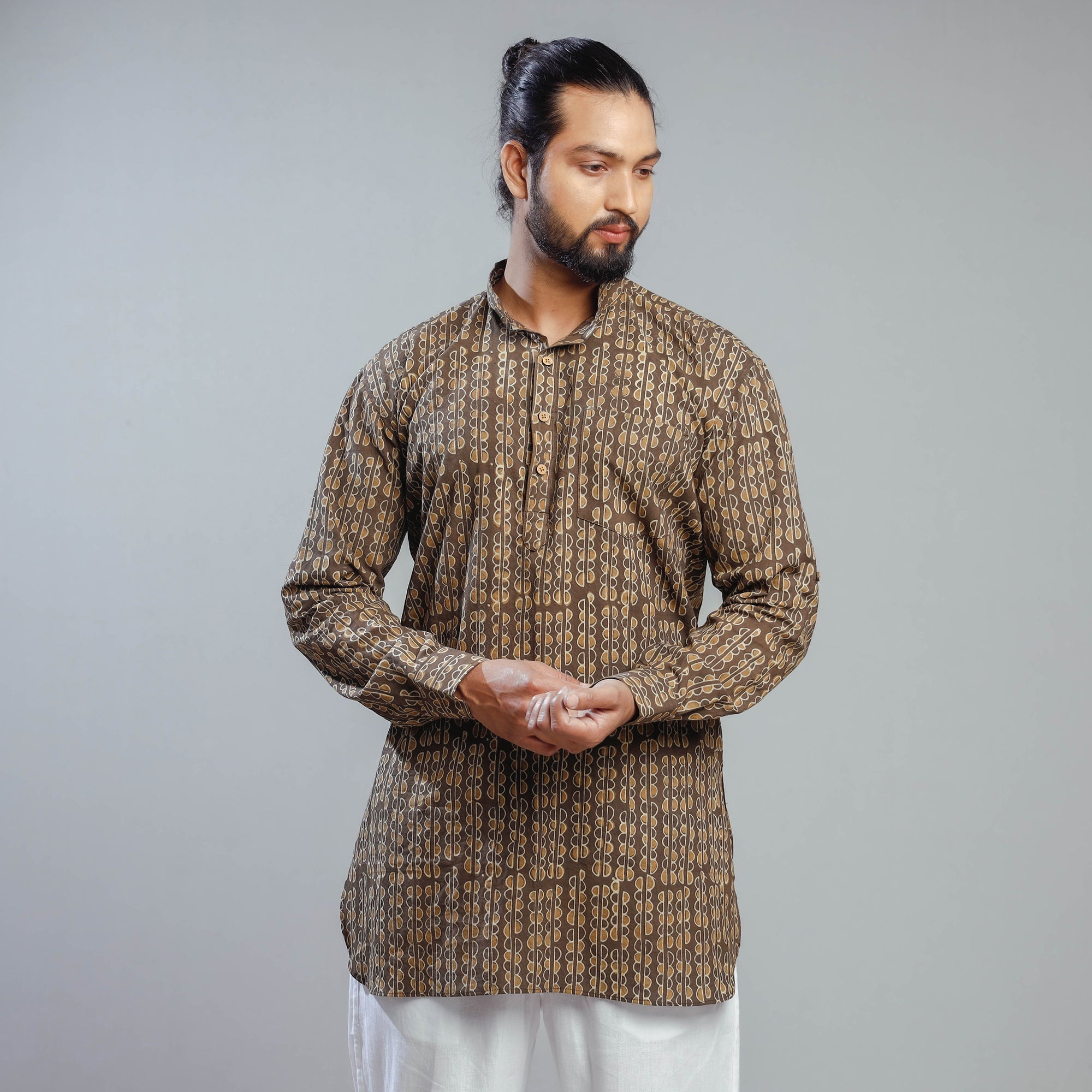Fine quality akola block printed cotton men's brown short kurta, made using naturally dyed fabric through the traditional mud resist process of hand block printing practised by the master artisans in Akola village of Rajasthan. This kurta features a stand collar, full sleeves, a front button placket, crisp wooden buttons, and a patch pocket on the front. It is the perfect addition to your casual wardrobe.