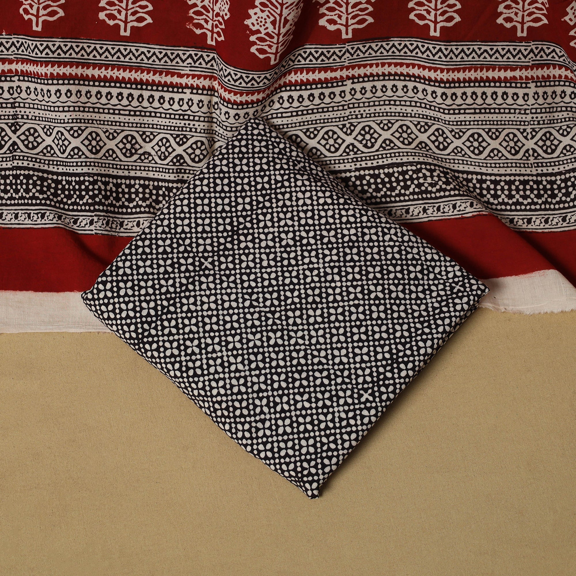 Fine quality bagh block printing cotton 3pc suit material set, made using natural dyes through traditional process of hand block printing by Bilal Khatri practiced in Bagh, the Dhar district of Madhya Pradesh.