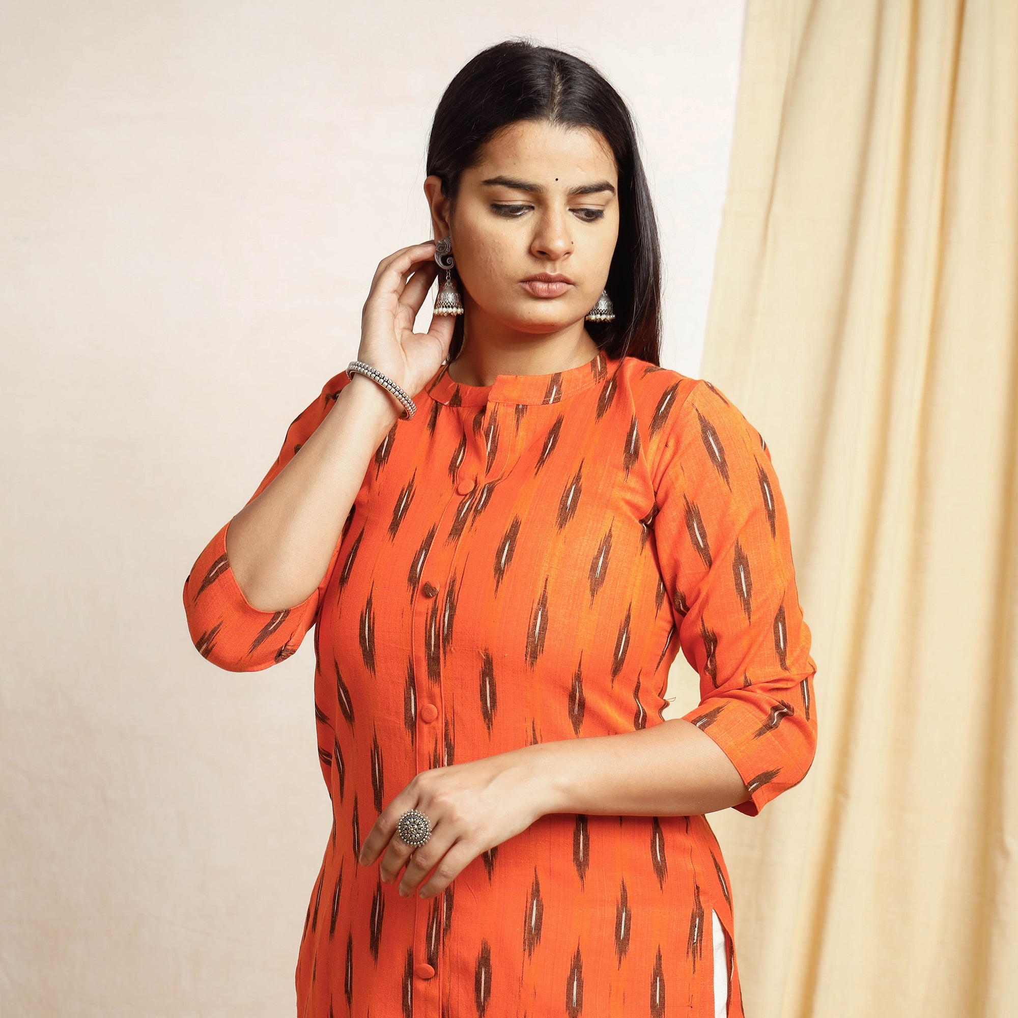 Look and feel beautiful in this uniquely designed pochampally ikat weaving cotton long kurta with side pocket. This cotton kurta makes you comfortable with ease all day long. Ikat has lovely patterns in extremely beautiful colours. Ikat fabrics are world famous for their colours, texture and designs. Indian Ikat is one of the fabrics that is always admired by the fashion designers around the world.