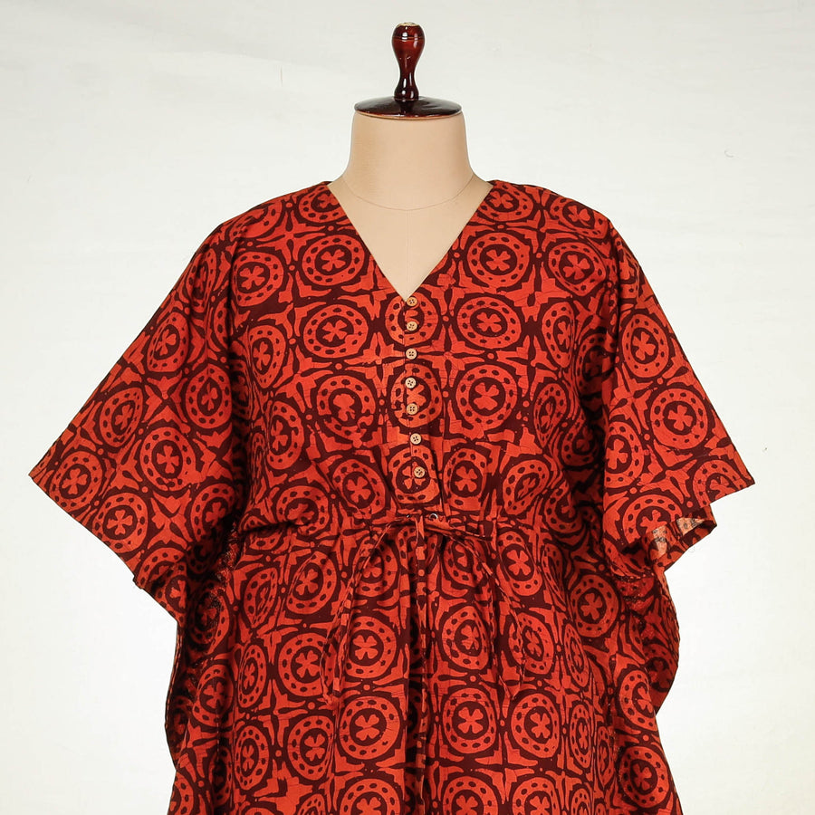 Fine quality hand batik printed cotton kaftan with tie-up waist. A traditional kaftan or caftan is an ankle-length garment with long, flowing sleeves. It has an adjustable drawstring waist. This loose-fitting cotton kaftan is enhanced by a soft touch and beautiful hand-block prints. This dress will allow you to move with ease and comfort. The drawstring waist tie will give you the freedom to customise the fit to suit your unique shape.